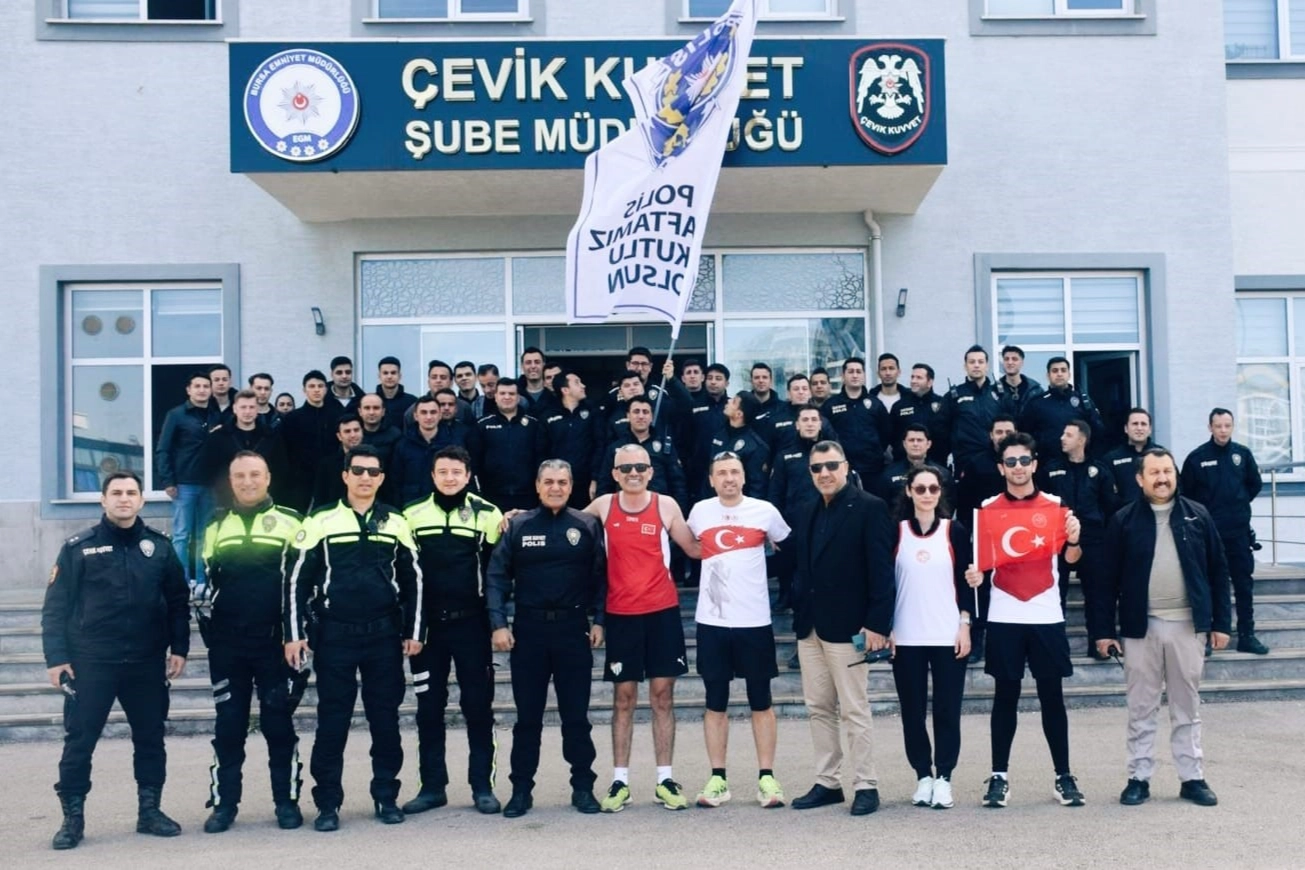 Kuvvet Şube Müdürlüğü'nde biten koşu sonrası sporcuları Şube Müdürü Mustafa Akıncı makamında ağırladı. Türk Emniyet Teşkilatı'nın 180. yıldönümü sebebiyle Bursalı Yasin Avcı, Gülbeyaz Özdemir, Metin Bozkurt ve Emin Sonlu, açtıkları 'Polis Haftanız kutlu olsun' pankartıyla Kent Meydanı'ndan koşmaya başladı.