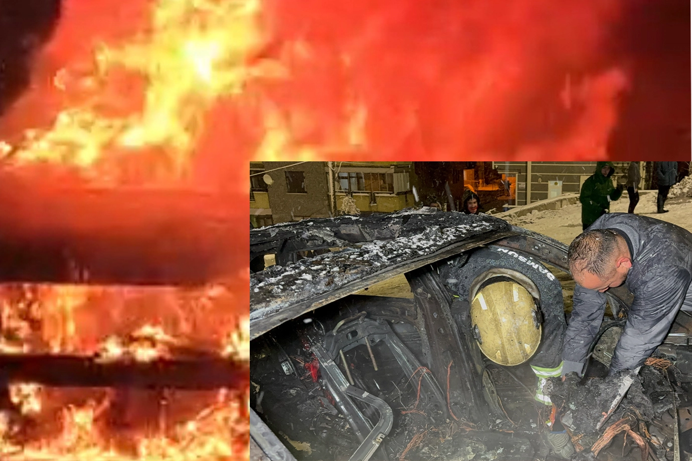 Uludağ Mahallesi Muhtarı Sevgi Baş Tumgan, "Kar sebebiyle üzücü bir durum yaşadık. Bir araç karda çıkarken zorlandığı için alev alıp yanmaya başladı. O sırada vatandaş araçtan çıktı. Can kaybımız yok. Çocuğuyla birlikte araç alev almaya başlayınca araçtan çıkıyor. Sürücülerden ricam bu hava şartlarında araçlarını zorlamamaları, mümkünse zincirlerini takmalarıdır. Dikkatli olursak ne mal kaybı ne de can kaybı yaşarız" diye konuştu.