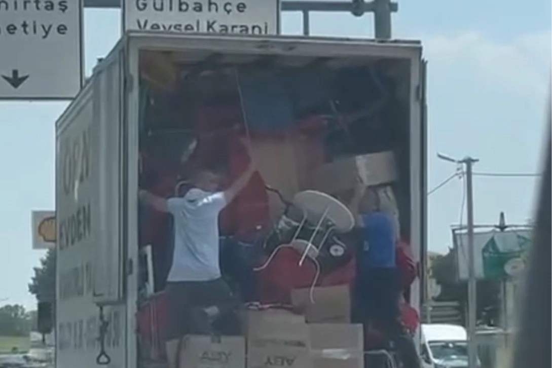 Trafiği tehlikeye tehlikeli taşımacılık kameraya yansıdı. Merkez Osmangazi ilçesi Yakın Çevreyolu Küçükbalıklı Mahallesi yakınlarında kameraya kaydedilen nakliye firmasına ait kamyon, eşya dolusu yükle kilometrelerce ilerledi. Eşyalarının düşmemesi için kendi canlarını tehlikeye atan 2 çalışan ilginç görüntüler oluşturdu. O anları hayretle izleyen trafikteki sürücüler, korna ve selektör atarak uyarıda bulunsa da sürücü uyarıları dikkate almadan yoluna devam etti. İlginç yolculuk kameraya saniye saniye yansıdı.