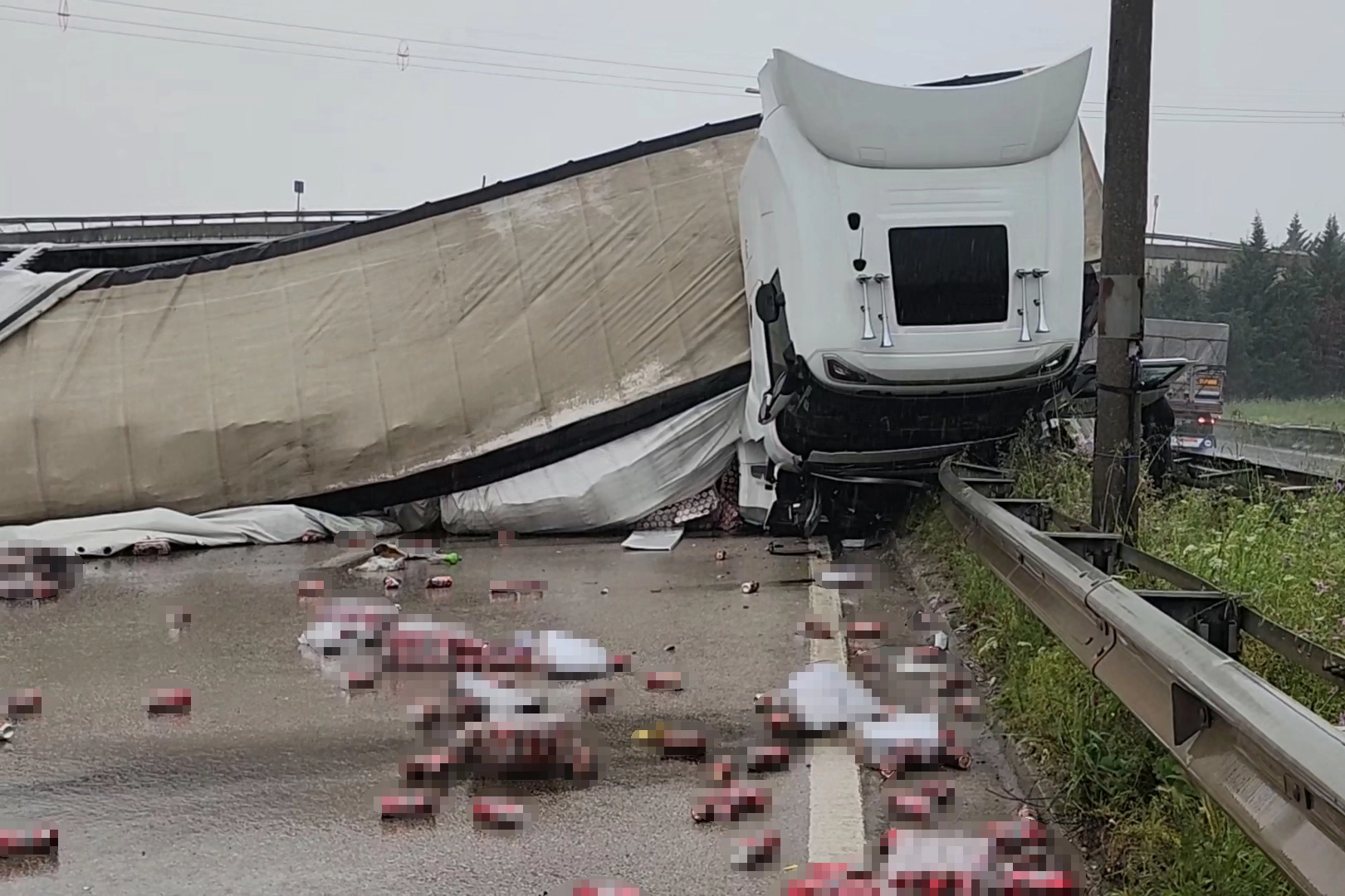 Kaza, saat 07.00 sıralarında Mustafakemalpaşa Terminal Kavşağı’nda meydana geldi. Bursa istikametine seyir halinde olan H.B idaresindeki tır, yağış etkisiyle kayganlaşan yolda sürücünün kontrolünden çıkarak önce bariyere çarptı ardından yola devrildi. Tırın dorsesinde bulunan çok sayıda alkol yola saçıldı. Tır şoförü kazadan yara almadan kurtulurken, trafik kısa süreliğine durma noktasına geldi. Ekiplerin müdahalesiyle yol bir süre sonra tek şeritten kontrollü olarak trafiğe açıldı. Olayla ilgili tahkikat başlatıldı.