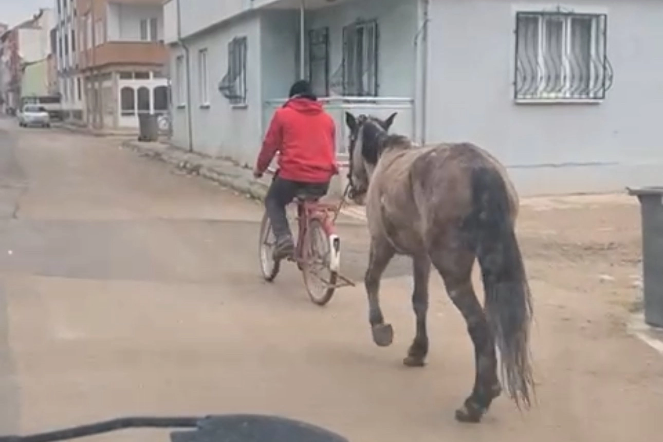 Olay, İnegöl ilçesinde meydana geldi. Edinilen bilgiye göre, kimliği öğrenilemeyen bir şahıs bisikletine atı bağlayarak götürdü. Bir süre boyunca atı bisikletine bağlı şekilde götüren şahıs daha sonra ara sokaklara girerek gözden kayboldu.