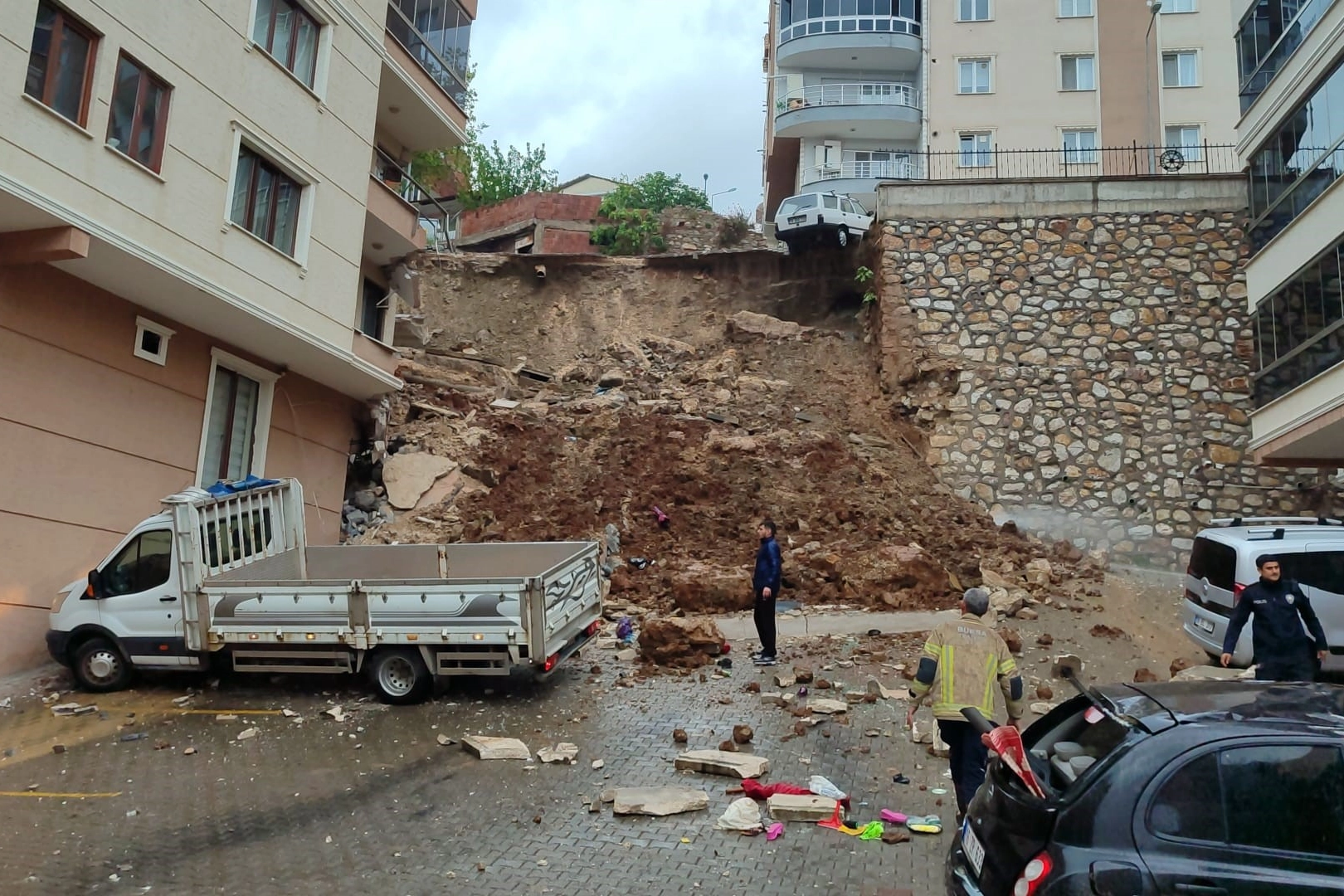 Edinilen bilgiye göre, Gemlik ilçesi Balıkpazarı Yeni Mahalle’de gece saatlerinde başlayan yoğun yağış, bir inşaat firmasının yaptığı istinat duvarını sabah saatlerinde yıktı. Büyük bir gürültü ile çöken duvar 2 apartmana zarar verirken binada yaşayan 2 kişi de yaralandı. Ayrıca sitenin otoparkında bulunan 2 araç da hasar gördü. Duvarın çökmesi ile birlikte vatandaş durumu ekiplere bildirdi. Kısa sürede olay yerine itfaiye, AFAD, sağlık ve polis ekipleri sevk edildi. Ekiplerin çalışmaları devam ediyor. Bursa Valisi Mahmut Demirtaş gelişmeleri yakından takip ederken, Gemlik Kaymakamı Hasan Göç de olay yerine geldi.