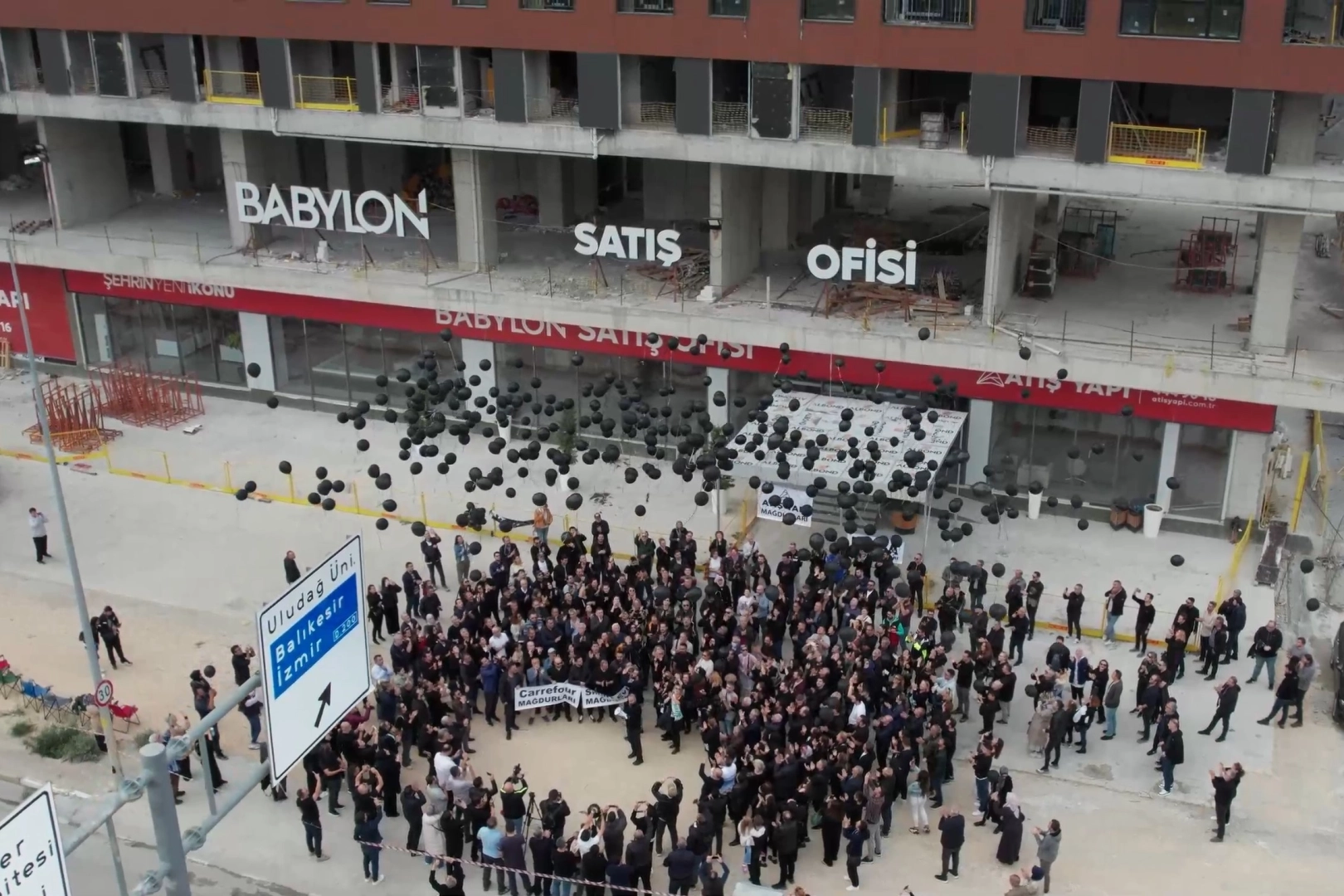 Bursa'da ev hayali kabusa dönen 3 bin 500 aile, inşaatı durdurulan şantiye önünde gökyüzüne binlerce siyah balon bıraktı. Bursa'da geçtiğimiz aylarda girdiği mali kriz sonrası konkordato ilan eden Atış Yapı'ya tepki büyüyor. Konkordato sonrası yarım bırakılan projelerle birlikte konut hayali kabusa dönüşen 3 bin 500 aile mağdur oldu. Adalet arayışını sürdüren aileler Atış Yapı'nın Nilüfer ilçesindeki inşaatı durdurulan Babylon şantiyesi önünde toplandı. Basın açıklaması yapan aileler, daha sonra gökyüzüne 3 bin 500 adet siyah balon bıraktı.