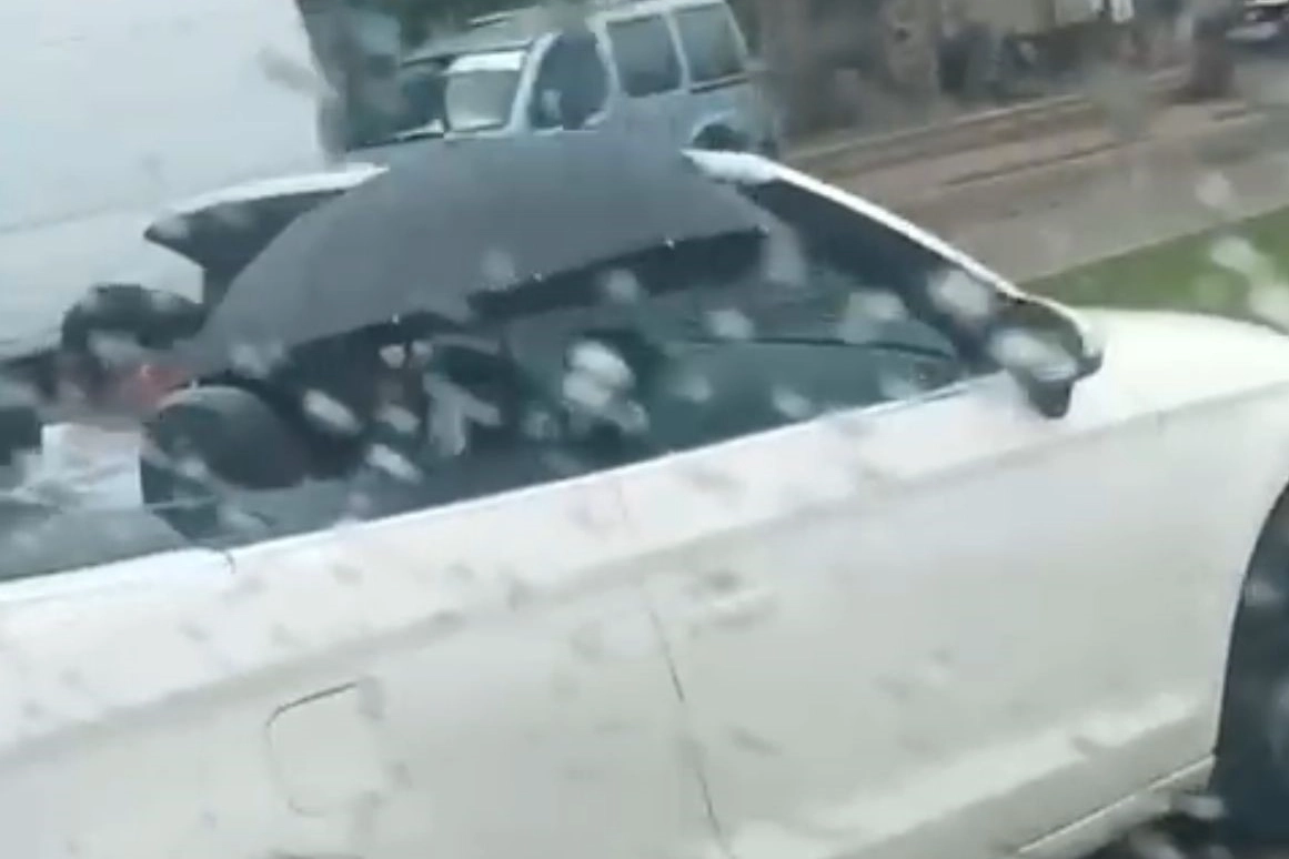 Bursa'nın merkez Nilüfer ilçesinde seyir halinde olan sürücü aracının açılır tavanını kapatamayınca yan koltukta oturan arkadaşı yağmurdan korunmak için farklı bir yönteme başvurdu. Şemsiye açarak seyahat eden sürücü ve arkadaşı, yoldan geçen diğer sürücüler ve yayalar tarafından şaşkınlıkla izlendi. Bazı vatandaşlar, sürücünün bu cesur ve eğlenceli hareketine gülerek tepki verirken, kimisi de o anları cep telefonu kamerasıyla kayda aldı.