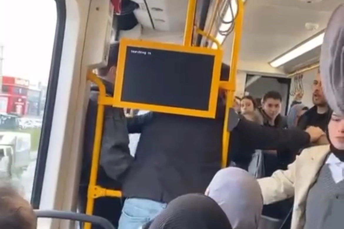 Taraflardan birinin tartıştığı kişiye tekme atıp, küfür ettiği anlar kameraya yansıdı. Bursa’nın Osmangazi ilçesi Sırameşeler mevkiinde seyahat etmek için metroya binen iki vatandaş arasında bilinmeyen bir nedenle sözlü tartışma çıktı.