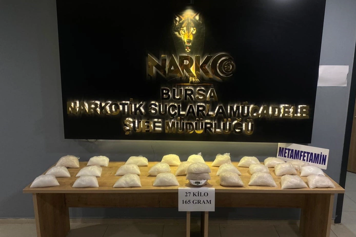 Bursa Narkotik Suçlarla Mücadele Şube Müdürlüğü, uyuşturucu madde ticareti yapan ikisi yabancı uyruklu olmak üzere 4 kişiyi teknik ve fiziki takibe aldı. Adım adım şüphelileri izleyen polis ekipleri, 4 şahsın İstanbul’da ikamet ettiğini tespit etti. İstanbul Narkotik Suçlarla Mücadele Şube Müdürlüğü ekiplerinin desteğiyle şafak vakti düğmeye basan ekipler, uyuşturucu baronları S.D., A.O., T.O. ve M.K.G.'yi ikametlerinde kıskıvrak yakaladı. Şüphelilerin ev ve araçlarında yapılan aramalarda 27 kilo 165 gram metamfetamin ve hassas terazi ele geçirildi. Polis ekiplerince gözaltına alınan şahıslar İstanbul'dan, Cumhuriyet Başsavcılığına sevk edilmek üzere Bursa'ya getirildi. 4 şüphelinin emniyetteki işlemleri devam ediyor.