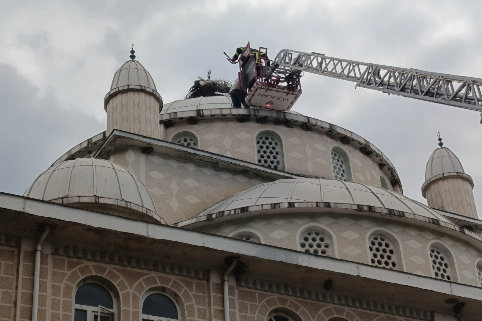 Bursa’nın İznik ilçesine bağlı Orhaniye köyünde, cami kubbesindeki yuvasında mahsur kalan leylek, itfaiye ekiplerinin üçüncü denemesinde kurtarılabildi.