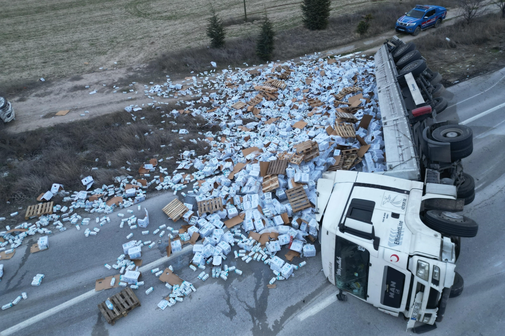 Afyonkarahisar'da yaklaşık 25 ton pastörize süt yüklü tırın kontrolden çıkarak devrilmesi sonucu karayolu yaklaşık yarım saat çift yönlü trafiğe kapandı. Kaza, Emirdağ-Eskişehir karayolu üzerinde meydana geldi. Edinilen bilgilere göre, BİM isimli zincir mağazaların Dost marka pastörize sütünü taşıyan B.Y. idaresindeki 42 DSA 08 plakalı tır, sürücüsünün direksiyon hakimiyetini kaybetmesi sonucu kontrolden çıktı. Savrulan araç yol ortasına devrildi. Kazada ölen ya da yaralanan olmazken, tırın dorsesindeki yaklaşık 25 ton süt çevreye dağıldı. Kaza nedeniyle karayolu yaklaşık yarım saat trafiğe kapalı kaldı.