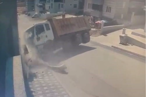 Kaza, saat 15.43'te Fatih Mahallesi Aşık Veysel Caddesi'nde meydana geldi. Yusuf K. (45) yönetimindeki 49 DC 275 plakalı kum yüklü kamyonun yokuş aşağı geri giderken freni patladı. Sürücünün kontrolünden çıkan araç hızla gitmeye başladı. Sürücü hızlanan araçtan atlarken, araç sitenin giriş duvarına çarparak devrildi. Araç devrildiği sırada kaldırımda bulunan bir vatandaş, kaçarak saniyelerle kurtuldu. Yaralı sürücü, kaza yerine sevk edilen embulansla İnegöl Devlet Hastanesine kaldırıldı. Kaza anı bir iş yerinin güvenlik kamerasına saniye saniye yansıdı. Polis kazayla ilgili inceleme başlattı.