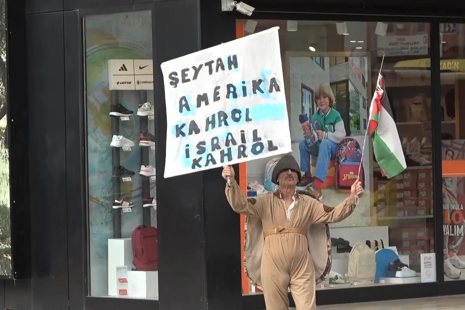 Bursa'da yaşayan ve birçok sosyal sorumluluk projelerine imza atan tiyatro sanatçısı Bahtiyar Keskin, bu kez çeşitli hayvan kostümleri giyerek İsrail ve Amerika'nın Filistin'e uyguladığı zulmü protesto etti. Bir ay boyunca trafik lambalarında eline 'Şeytan Amerika Kahrol, İsrail Kahrol' pankartı alarak vatandaşlara Filistin halkına uygulanan insanlık suçunu anlatan Keskin, "Eylemi gerçekleştirme maksadım tüm halkı İsrail'in Filistin'de yaptığı zulmü insanlığa duyurabilmek" dedi. Geyik, karınca, timsah, kaplumbağa, arı gibi kostümleriyle insanların dikkatini çeken Keskin, savaş bitene kadar eylemlere devam edeceğini söyledi.