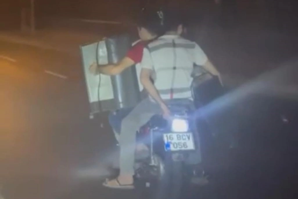Bursa'da motosiklet ile trafiğe çıkan bir sürücü 3 kişi yolculuk yaptığı yetmezmiş gibi bir de arkadaşına yük taşıttı. O anlar cep telefonu kamerasına yansıdı.