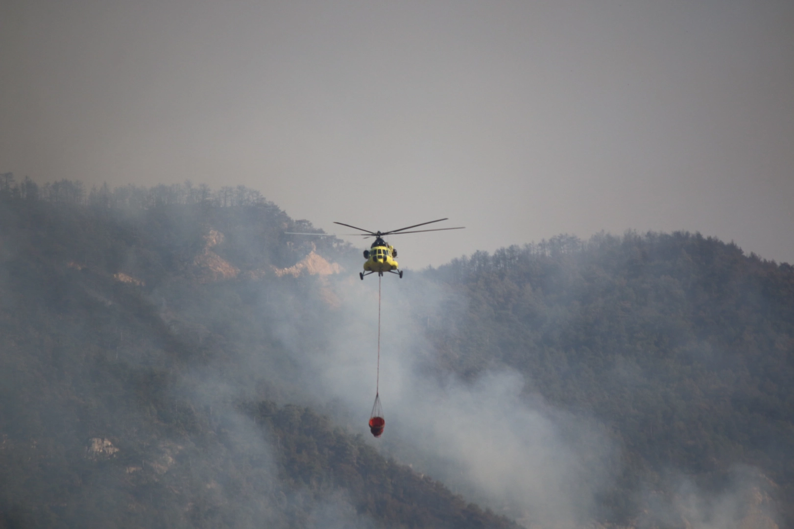 100 saattir merkez ve çevresindeki köylerde etkili olan yangına ekiplerin havadan ve karadan müdahalesi sürüyor. Arazinin sarp ve ulaşım güç olmasına rağmen havadan yapılan müdahaleler ile alevlerin enerjisi düşürülüyor. Yangının ilk anından itibaren söndürme çalışmalarına katılan kadın pilot, "Her giden canlıyı gördükçe çok üzülüyoruz" ifadelerini kullandı.