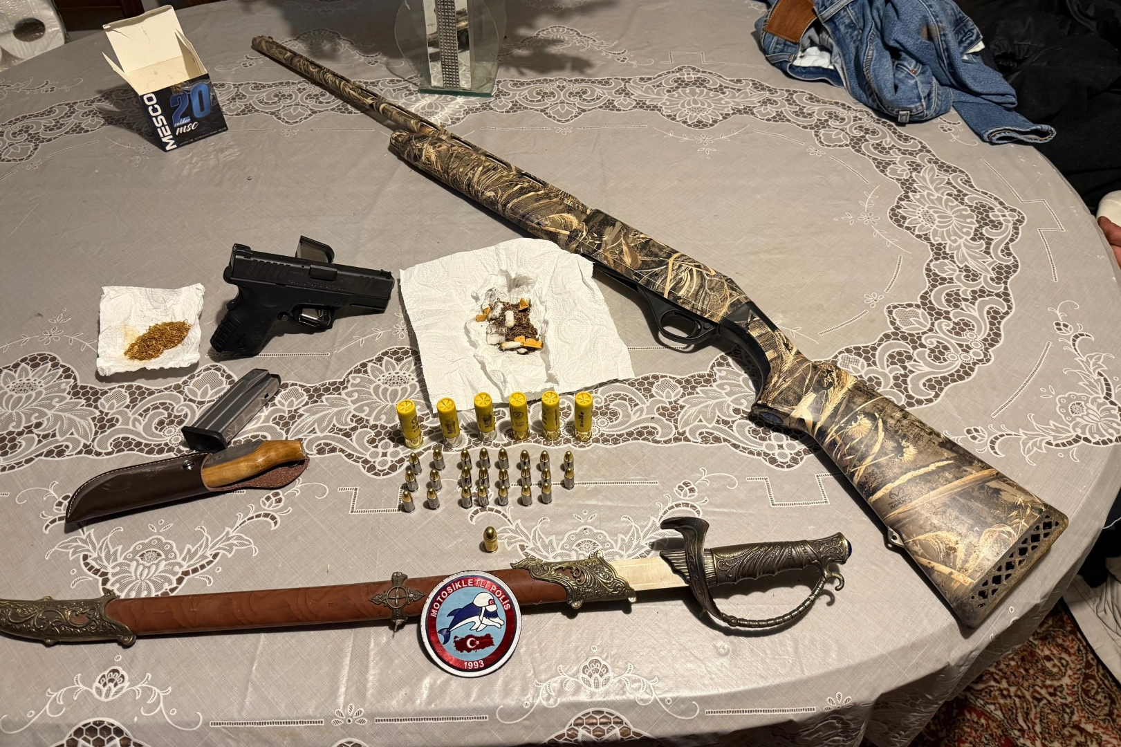 Şüphe üzerine durdurulan bir araçta ve devamında şahsın evinde yapılan aramalarda 1 adet ruhsatsız tabanca, 73 adet 9 mm fişek, 3 adet şarjör, 1 adet kılıç, 1 adet yivsiz av tüfeği, 6 adet kartuş, 1 adet kama tarzı bıçak ile daralı ağırlığı 7,20 gram olan narkotik madde ele geçirildi.