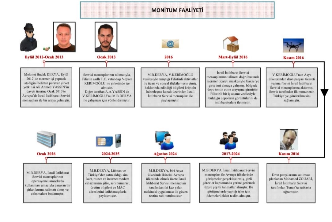 Milli İstihbarat Teşkilatı, "MONİTUM Faaliyeti" sonucu İsrail İstihbarat Servisi’ne çalıştığını tespit ettiği 2 kişiyi yakaladı. MİT, İstanbul Cumhuriyet Başsavcılığı ve İstanbul İl Emniyet Müdürlüğü TEM Şube Müdürlüğünce yürütülen çalışmalar sonucu Mehmet Budak Derya ve Veysel Kerimoğlu gözaltına alındı. Mermer tüccarlığından İsrail casusluğuna Maden Mühendisi olan Mehmet Budak Derya, 2005 yılında kendi şirketini kurdu, Mersin Silifke’de mermer ocağı açtı. Dünyanın birçok ülkesine ticaret yapmaya başladı. Bu sayede İsrail İstihbarat Servisi’nin dikkatini çekti. İsrail’in kurduğu paravan şirketin yetkilisi Ali Ahmed Yassın kod adlı şahıs, Eylül 2012’de Mehmet Budak Derya’yı ofisinde ziyaret ederek şirketinin onunla iş yapmak istediğini söyledi. Patronları ile tanışması için Avrupa’da bir ülkeye davet etti. Bunu bir iş fırsatı olarak gören Mehmet Budak Derya, Ocak 2013’te Avrupa’da şirketi sahibi kimliği altında İsrail İstihbarat Servisi mensupları ile bir araya geldi. Mehmet Budak Derya ile bir araya geldiği kişiler yapacakları mermer ticaretine ilişkin hususları görüştü. Kod adı Luis olan İsrail istihbaratçısı, M.B. Derya’ya Filistin asıllı Türk vatandaşı Veysel Kerimoğlu’nu işe almasını söyledi. Mehmet Budak Derya, Kerimoğlu ile birlikte yürüttükleri faaliyetler hakkında kendilerine bilgi vermeleri yönünde talimat aldı. Eş zamanlı olarak Mehmet Budak Derya ile ilk irtibatı kuran Ali Ahmed Yassın da Veysel Kerimoğlu’nu M.B. Derya ile çalışması hususunda yönlendirdi. Kaynaklarının konumunu yükseltmek için işçi buldular İsrail İstihbarat Servisi mensuplarından aldığı talimat doğrultusunda Veysel Kerimoğlu’nu işe alan ve maaşını bile istihbaratçılardan temin eden Mehmet Budak Derya, arkadaşlık ilişkisi de geliştirdi. M.B. Derya, V. Kerimoğlu ile attıkları her adımı İsrail servisi ile paylaştı. Mehmet Budak Derya, Veysel Kerimoğlu vesilesiyle Orta Doğu ülkelerine yönelik ticari faaliyetlerini arttırdı. Yine V. Kerimoğlu sayesinde tanıştığı, İsrail’in Orta Doğu ülkelerine yönelik politikalarına muhalif Filistinliler ile sosyal ve ticari ilişkilerini geliştirdi. Bu şahıslar hakkında topladığı bilgileri İsrail servisine aktardı. İsrail’in Gazze’yi işgal politikası çerçevesinde tesis ettiği ticari ilişkileri de kullanarak Gazze’ye giriş izni almaya çalıştı. Gazze’de aradığı depoların fotoğraflarını İsrail istihbaratına iletti. İsrail Servisi’nin desteği ile işlerini büyüttü Ticari faaliyetlerini mermer alanıyla kısıtlamak istemeyen Veysel Kerimoğlu, 2016 yılı başlarında Mehmet Budak Derya’ya dron parçaları ticareti yapmaları üzerine bir teklifte bulundu. Attıkları her adımı İsrail servisine bildiren M.B. Derya, bu teklifi anında görüştüğü istihbaratçılara iletti. İsrail servisinin de işine gelen bu girişimin ilk numuneleri de İsrail İstihbarat Servisi tarafından temin edildi. Mehmet Budak Derya ve Veysel Kerimoğlu’nun birlikte dron satmaya çalıştığı Mohamed Zouari, İsrail İstihbarat Servisi tarafından Aralık 2016’da Tunus’ta suikasta uğradı. Üçüncü ülke görüşmesi Mehmet Budak Derya, İsrail istihbaratı ile 2013’te başlayan ilişkisini bugüne kadar sürdürdü. Bu süreç içerisinde Luis, Jesus/Jose, Dr.Roberto/Ricardo, Dan/Dennis, Mark, Elly/Emmy ve Michael kod adlı birçok istihbaratçı ile çeşitli Avrupa ülkelerinde üçüncü ülke görüşmeleri gerçekleştirdi. İsrail servisinin testlerini geçti İsrail servisi, uzun yıllardır yürüttükleri operasyonu riske atmamak adına gizliliğe son derece önem veriyordu. Bu kapsamda, İsrail servisi Mehmet Budak Derya’ya kriptolu bir haberleşme sistemi sağladı. Ayrıca, M.B. Derya sıkı tedbirler çerçevesinde 2016 yılında bir Asya ülkesinde yalan makinesi uygulamasına tabi tutuldu. M.B. Derya testi başarı ile tamamladı. Yalan makinesi testine girmesi sonrasında durumun ciddiyetini anlayan M.B. Derya, içinde bulunduğu faaliyet konusunda daha da hassas davranmaya başladı. İsrail servisi tarafından M.B. Derya’ya ikinci yalan makinesi testi Ağustos 2024’te bir Avrupa ülkesindeki otelde yapıldı. İsrail’in Bu testini de sorunsuz atlatan Derya, operasyonda bir üst aşamaya geçti. Mehmet Budak Derya, İsrail İstihbarat Servisi mensuplarının talimatları doğrultusunda Türkiye ve diğer ülkelerden sim kartları, internet modem ve router cihazları satın alarak, bunların şifre, seri numarası, üretim bilgileri ve MAC adresleri gibi bilgilerinin yer aldığı etiketlerin fotoğraflarını muhataplarına iletti. Paravan şirket kuracakken yakalandı Ocak 2026’da yurt dışında İsrail İstihbarat Servisi görevlileri ile çok önemli bir görüşme yapan Mehmet Budak Derya’nın operasyonel amaçlarla kullanılmak üzere yurt dışında paravan bir firma kurması yönünde planlar yapıldı. Yapılan planlamaya göre; söz konusu kurulacak paravan firmalar ile uluslararası ticari tedarik zincirine sızılması amaçlandı. Paravan şirket aracılığı ile İsrail İstihbarat Servisi'nin belirlediği ülkelerden temin edilecek ürünlerin yine İsrail servisi tarafından nihai kullanıcının bulunduğu ülkeye sevkiyatı koordine edilecekti. Planlamaya göre, sevkiyat sürecinde Asya ülkelerinde faaliyet gösteren yasal üç firma bulunacak ve bahse konu firmalar ile işbirliği yapılacaktı. Bulunacak firmalardan ilki, ürünleri piyasadan temin ederek deposuna alacak ve ambalajlarını değiştirecekti. İkinci firma ürünleri ilk firmadan teslim alarak kendi deposunda bir süre muhafaza edecekti. Üçüncü firma ise ikinci firmadan teslim alacağı söz konusu ürünleri İsrail İstihbarat Servisince satılması istenen nihai kullanıcıya ait şirkete ihraç edecekti
