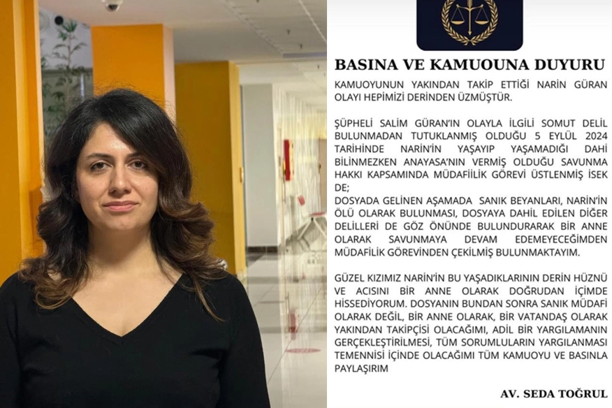 “Kamuoyunun yakından takip ettiği Narin Güran olayı hepimizi derinden üzmüştür. Şüpheli Salim Güran'ın olayla ilgili somut delil bulunmadan tutuklanmış olduğu 5 Eylül 2024 tarihinde Narin'in yaşayıp yaşamadığı dahi bilinmezken anayasanın vermiş olduğu savunma hakkı kapsamında müdafilik görevi üstlenmiş isek de; dosyada gelinen aşamada sanık beyanları, Narin'in ölü olarak bulunması, dosyaya dahil edilen diğer delileri de göz önünde bulundurarak bir anne olarak savunmaya devam edemeyeceğimden müdafilik görevinden çekilmiş bulunmaktayım. Güzel kızımız Narin'in bu yaşadıklarının derin hüznü ve acısını bir anne olarak doğrudan içimde hissediyorum. Dosyanın bundaki sonraki müdafi olarak değil, bir anne olarak, bir vatandaş olarak yakından takipçisi olacağım. Adil bir yargılamanın gerçekleştirilmesi, tüm sorumluların yargılanması temennisi içinde olacağım.”