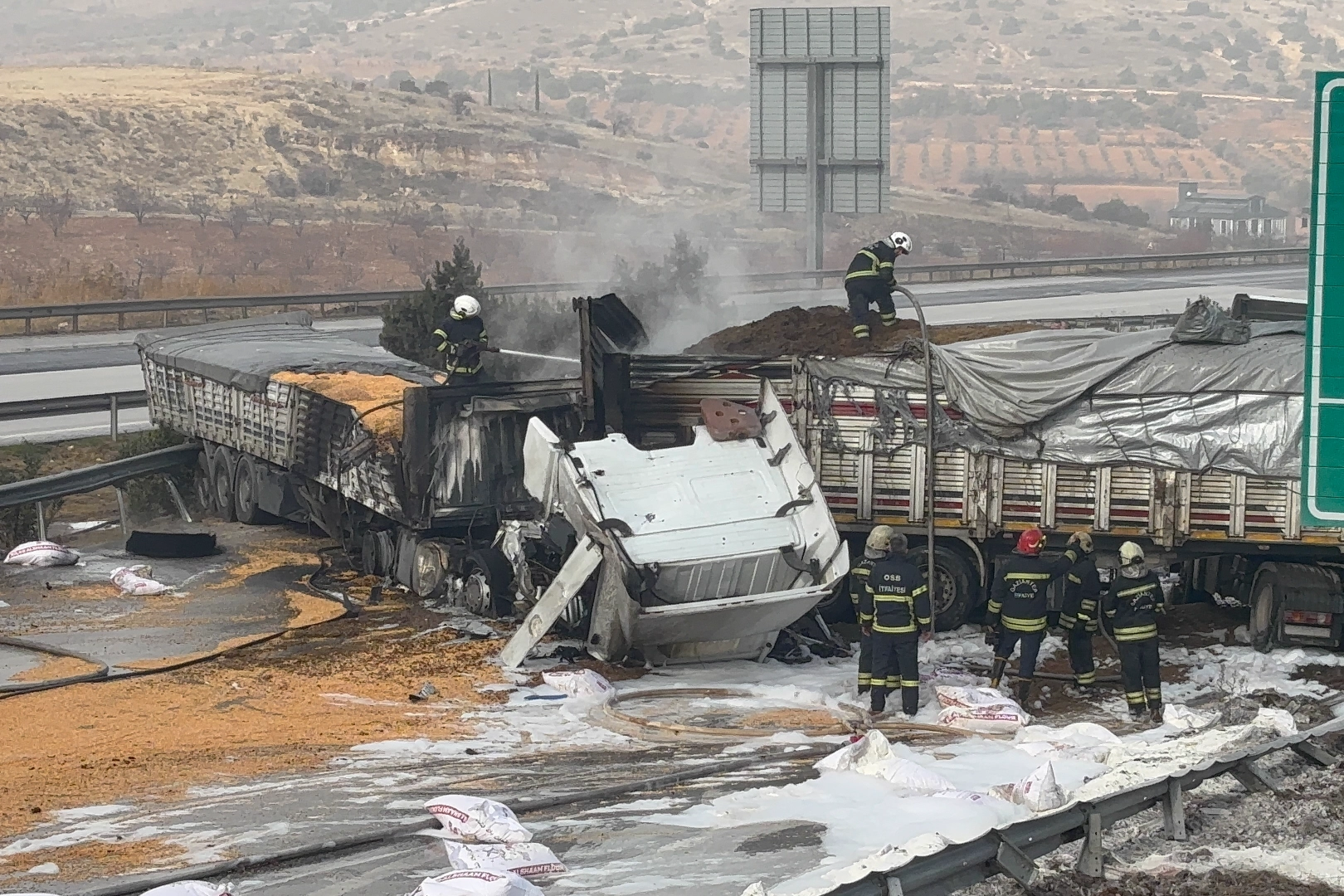 Tarsus-Adana-Gaziantep (TAG) Otoyolu Gaziantep batı gişeleri yakınlarında 3 tırın çarpışması sonucu yangın çıktı. Yangın itfaiye ekiplerince söndürürken otoyolun Adana istikameti tedbir amaçlı trafiğe kapatıldı. Kaza, Tarsus-Adana-Gaziantep (TAG) Otoyolu Gaziantep batı gişeleri kesiminde meydana geldi. İddiaya göre, plakaları ve sürücülere öğrenemeyen mısır, un vs gübre yüklü 3 tırın karıştığı kaza sonrası yangın çıktı. 112 Acil Çağrı merkezine yapılan ihbar üzerine olay yerine çok sayıda jandarma, sağlık ve itfaiye ekip sevk edildi.