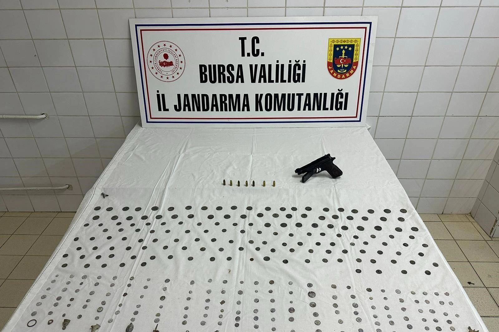 Bursa İl Jandarma komutanlığı ekipleri tarafından düzenlenen tarihi eser kaçakçılığı ile mücadele operasyonu çerçevesinde, tarihi eser sattığı tespit edilen A.M. (44) ve M.A.D. (30) isimli şahıslar yakalandı. Yapılan operasyonda şüphelilerin tarihi eserleri satmak için Nilüfer ilçesi Atlas Mahallesi Çamlık mevkiine gelecekleri tespit edildi. Şahısların üzerlerinde ve kamyonette yapılan aramada Roma dönemine ait 297 adet tarihi sikke, 30 adet tarihi obje, 1 adet tabanca ve fişek ele geçirildi. Olayla ilgili şüpheliler A.M. ile M.A.D. isimli şahısların işlemlerinin devam ettiği öğrenildi.