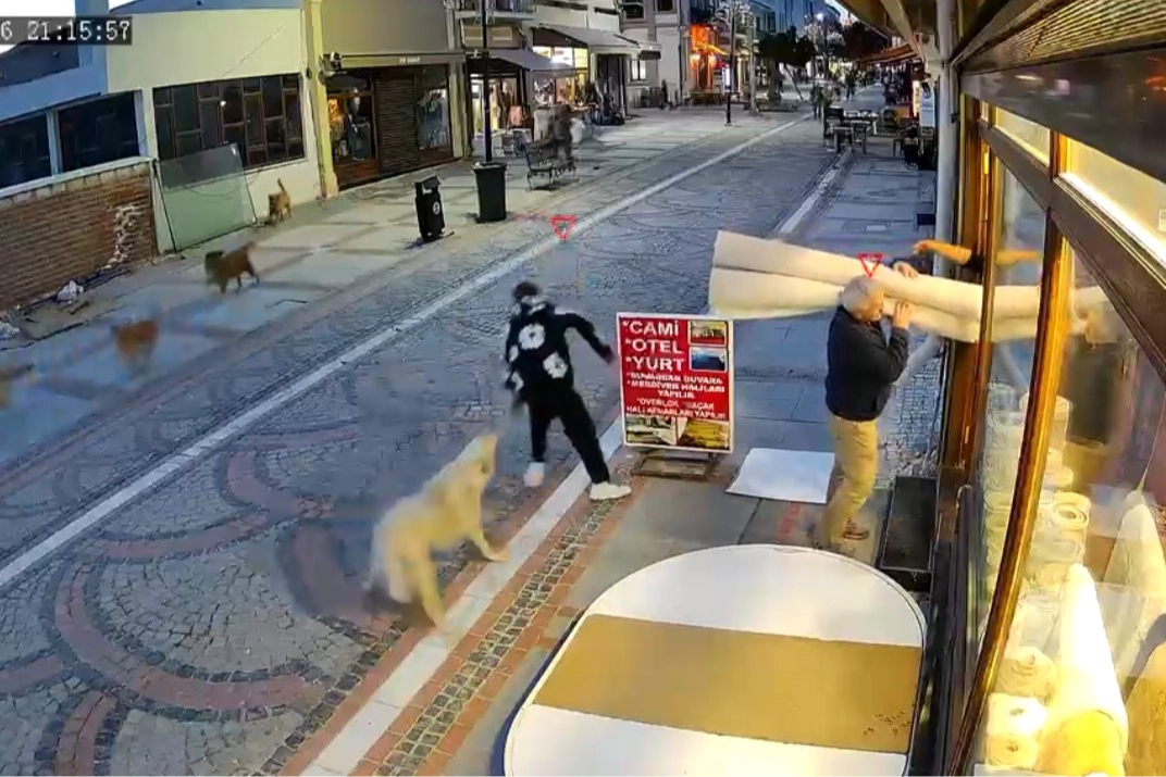 Yaşanan panik anları çevredeki bir iş yerinin güvenlik kamerasına yansıdı. Görüntülerde, Hamza D.'nin köpeklerden kaçarak bir iş yerine sığındığı görüldü.