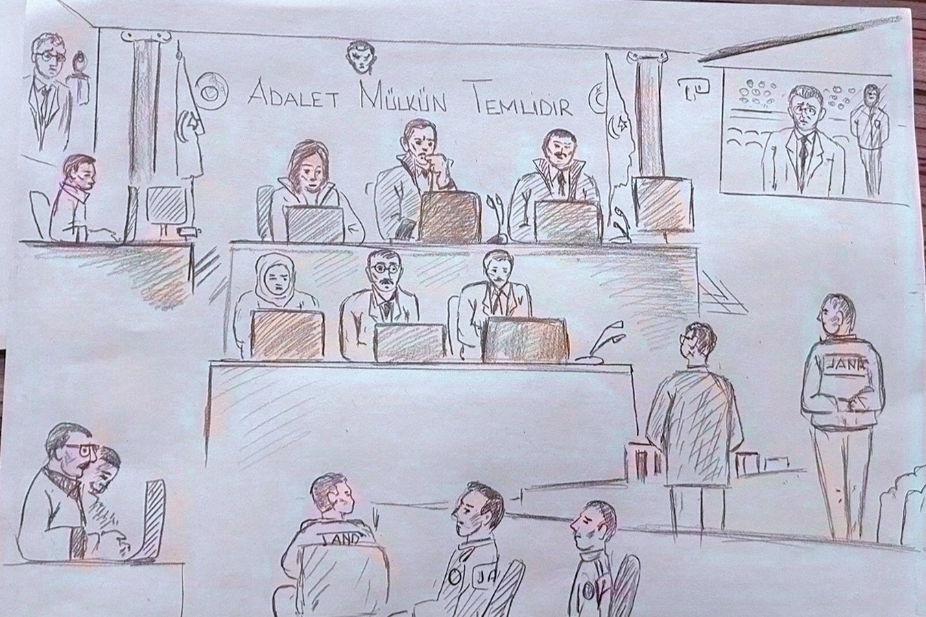 Hazırlanan iddianame kapsamında Ekrem İmamoğlu'nun yargılanmasına başlanacak. İstanbul 14. Ağır Ceza Mahkemesi'nce Marmara Ceza İnfaz Kurumları Yerleşkesi içerisindeki duruşma salonunda görüldü. Davada tutuklu sanık Ekrem İmamoğlu savunma yaptı. Ekrem İmamoğlu'nun ifadeleri İhlas Haber Ajansı adliye ressamı Cengiz Karslıoğlu'nun çizimine yansıdı. Ekrem İmamoğlu'nun yüz ifadeleri çizimlerde yer buldu.