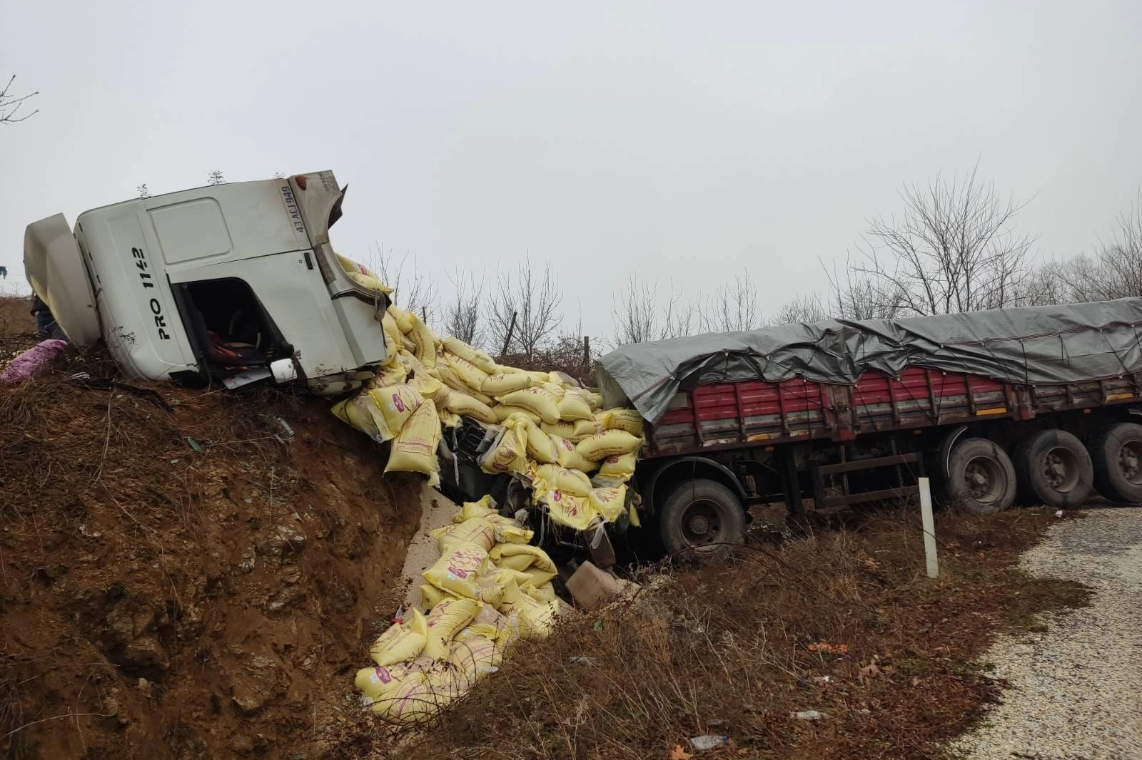 Kaza Bursa'nın İnegöl ilçesi ile Bilecik'in Pazaryeri ilçesini bağlayan yolda meydana geldi. Pazaryeri ilçesinden İnegöl'e seyreden sürücü Özgür Ö.(24) idaresindeki 43 ACJ 949 plakalı yem yüklü tırın iddiaya göre frenleri patladı. Yokuş aşağı kontrolden çıkan tır, yamaca çarparak durabildi. Kaza sonucu sürücü ile yanındaki yolcu Salih C.(25) yaralandı, yemler etrafa saçıldı. Yaralılar kaza yerine sevk edilen ambulansla İnegöl Devlet Hastanesi'ne kaldırıldı. Jandarma komutanlığı ekipleri kazayla ilgili soruşturma başlattı.