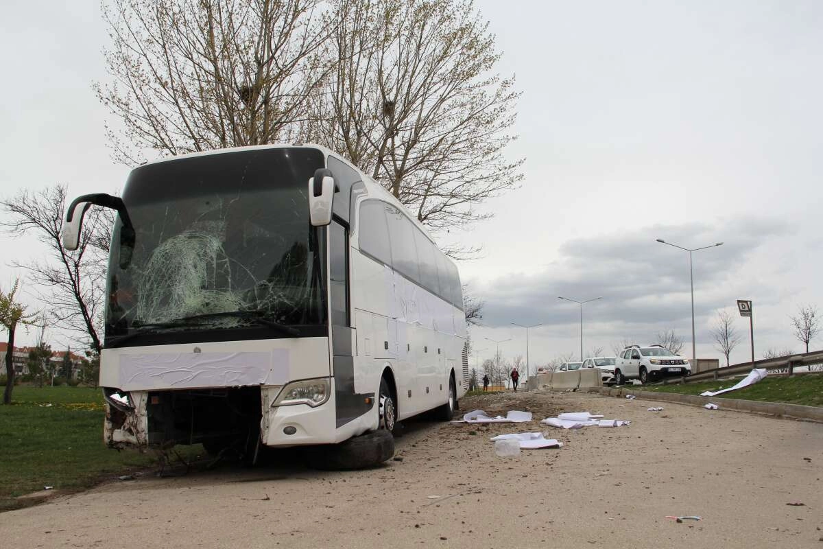 Kaza, sabah saatlerinde Bursa-Eskişehir karayolu Batıkent Mahallesi yakınlarında meydana geldi. Edinilen bilgilere göre, önüne çıkan köpeğe çarpmamak için manevra yapan otobüs şoförü Mesut Adak, direksiyon hakimiyetini kaybetti. Ayvalık-Ankara arası sefer yapan 44 LU 999 plakalı yolcu otobüsü, beton bloklara çarparak yoldan çıktı. Çarpmanın etkisiyle şoförün de içinde bulunduğu 17 kişi hafif şekilde yaralandı.