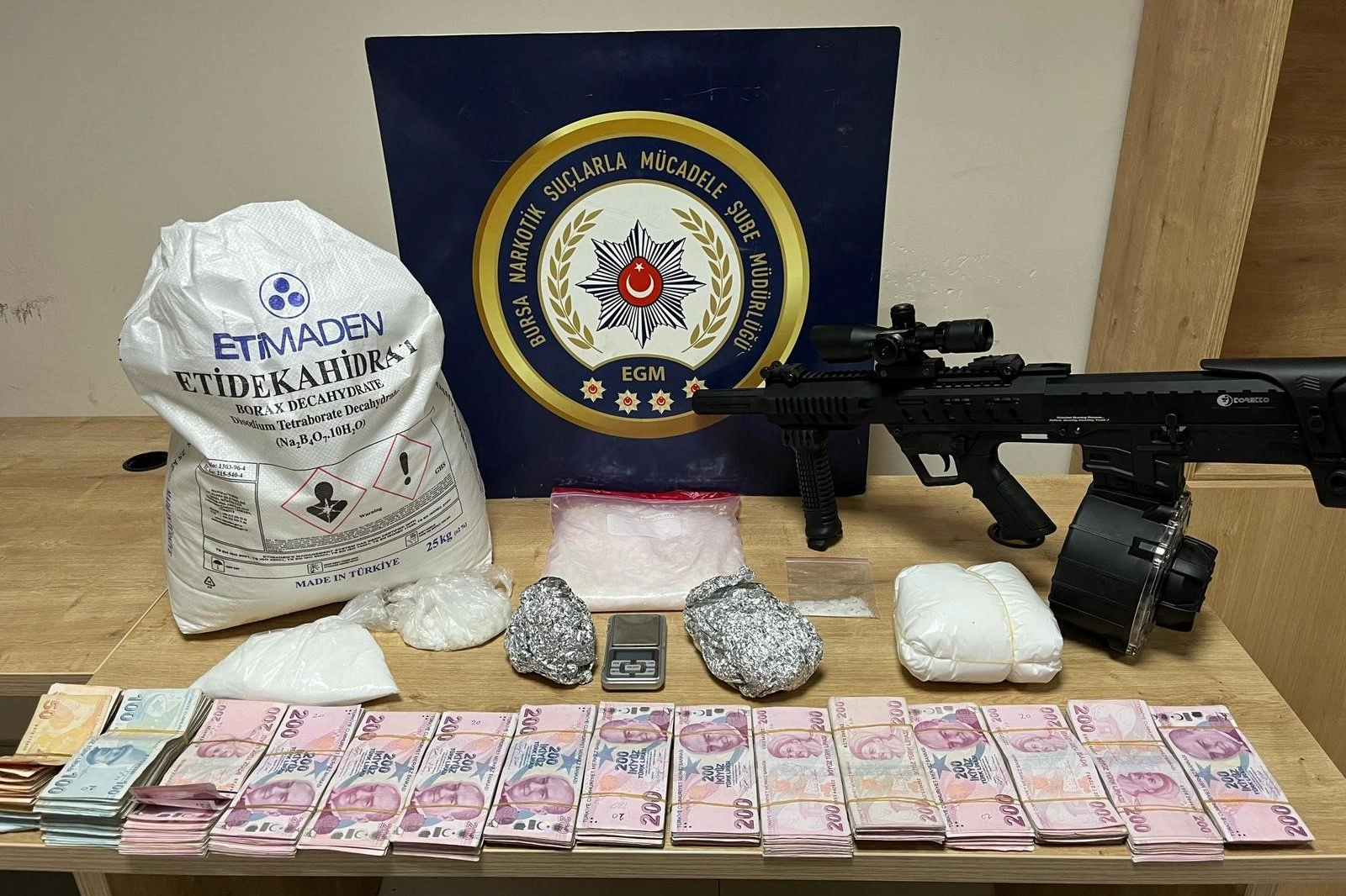 Edinilen bilgiye göre, Narkotik Suçlarla Mücadele Şube Müdürlüğü ekiplerince uyuşturucu veya uyarıcı madde ticareti yapan şahısların suç unsurları ile birlikte yakalanmalarına yönelik olarak yapılan çalışmalar neticesinde; Bursa genelinde uyuşturucu veya uyarıcı madde ticareti yaptığı tespit edilen K.Y. isimli şahıs yakalanarak gözaltına alındı. Şahsın üzerinde, ikametinde ve aracında yapılan aramalarda; 1 kilo 200 gram Metamfetamin, 17 kilo uyuşturucu madde çoğaltımında kullanıldığı değerlendirilen boraks maddesi, 1 adet hassas terazi, 1 adet ruhsatsız tüfek, uyuşturucu uyarıcı madde ticaretinden elde edildiği tespit edilen 290 bin lira nakit para ele geçirildi. Yapılan çalışmalar neticesinde yakalanan K.Y. isimli şahıs hakkında Uyuşturucu veya Uyarıcı Madde Ticareti Yapmak suçundan yürütülen adli tahkikat devam ediyor.