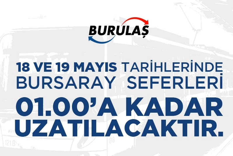 Bursa Büyükşehir Belediyesi, 19 Mayıs Atatürk’ü Anma, Gençlik ve Spor Bayramı kutlama ve etkinliklerinin coşkulu kalabalıklarla yapılabilmesi amacıyla kent için toplu ulaşımın 19 Mayıs Pazar günü ücretsiz olacağını açıkladı. Vatandaşlar, Bursakart kullanmak suretiyle kent içi ayakta yolcu taşıyan hatlarda ücretsiz uygulamadan yararlanabilecek. Bursalıların Hüdavendigar Kent Parkı’ndaki ‘Gençlik Şöleni’ne rahatça ulaşabilmesi amacıyla da 18-19 Mayıs Cumartesi ve Pazar günlerinde BursaRay seferleri saat gece 01.00’a kadar uzatıldı. Ayrıca 18-19 Mayıs Cumartesi ve Pazar günleri saat 12.00 ile gece 01.00 arasında Acemler-Hüdavendigar Kent Parkı etkinlik alanı arası ücretsiz ring servisinin olacağını da açıklandı.