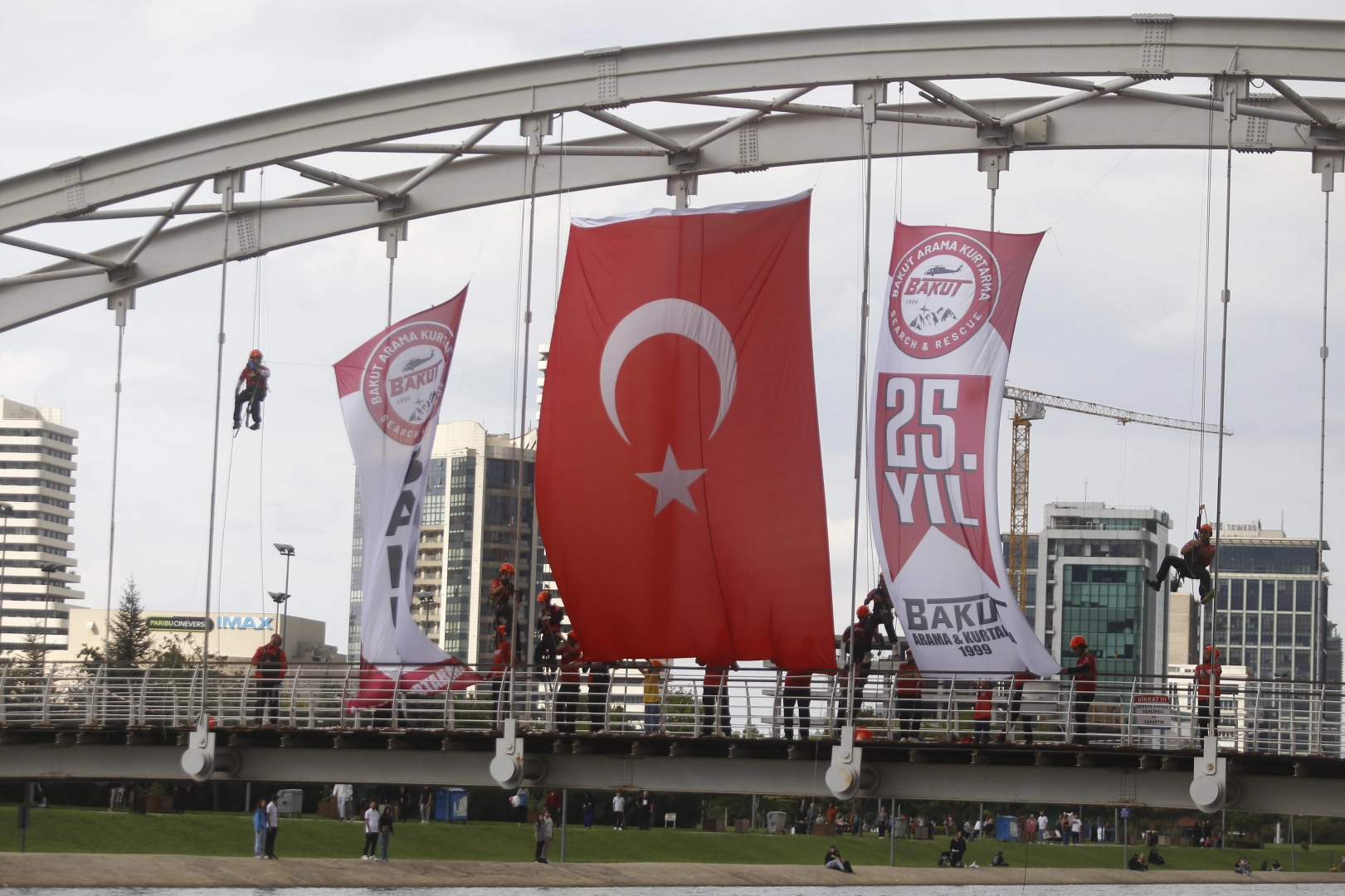 Arama-kurtarma çalışmalarıyla deprem, sel ve doğal afetlerde birçok kişinin hayatını kurtaran sivil toplum kuruluşlarından Bursa Arama Kurtarma Derneği (BAKUT), kuruluşunun 25. yılını Hüdavendigar Kent Parkı'nda kutladı. İstiklal Marşı'nın başlamasıyla halat yardımıyla Hüdavendigar Kent Parkı'nın köprüsü üstüne çıkan ekipler, dev Türk bayrağını açtı. Senaryo gereği köprü ayağında bulunan yaralıyı sedye ile bota alan BAKUT ekipleri, dereden geçerek yaralıyı halat yardımıyla kurtardı.