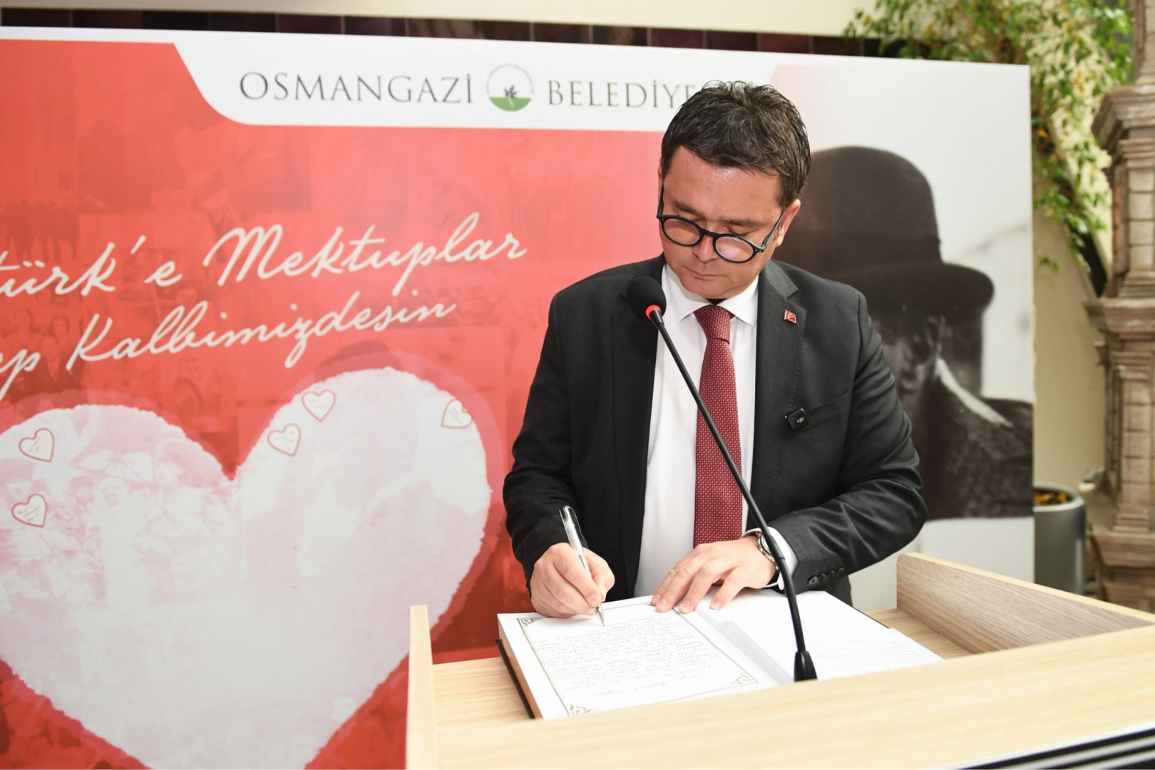 Atatürk Defteri Osmangazi Belediye Başkanı Erkan Aydın, CHP Bursa Milletvekili Hasan Öztürk, mektup yazan çocukların ve belediye personelinin katıldığı törenle Osmangazi Belediyesi’nin girişine konuldu. Törene katılan Osmangazi Belediye Başkanı Erkan Aydın ve CHP Bursa Milletvekili Hasan Öztürk, Atatürk Defterine duygu ve düşüncelerini yazarak Atatürk’e olan sevgi ve bağlılıklarını bir kez daha dile getirmiş oldu. Törene katılan çocuklar Atatürk’e yazdıkları mektuplarını Atatürk Defterinden sırayla okudu. Ayrıca Osmangazi Belediyesi’nin girişine belediyeye gelen misafirlerin Cumhuriyet ve Atatürk’ü anlatan düşüncelerini etiketlere yazarak yapıştırabilecekleri bir Anı Duvarı oluşturuldu. Anı Duvarı 10 Kasım’a kadar Osmangazi Belediyesi’nin girişinde bulunacak.