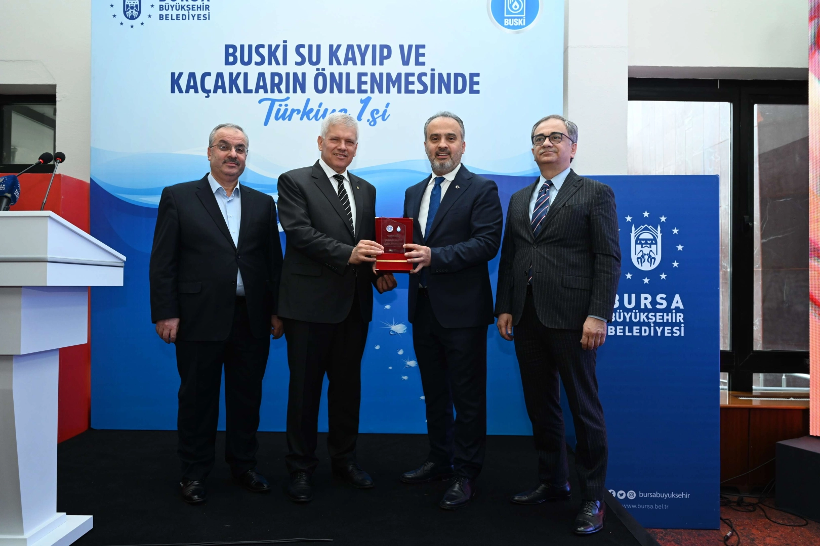 Başkan Aktaş, törenin sonunda Bursa’nın altyapısına değer katan gayretli çalışmaları nedeniyle tüm BUSKİ çalışanları adına BUSKİ Genel Müdürü Güngör Gülenç’e teşekkür plaketi verdi.