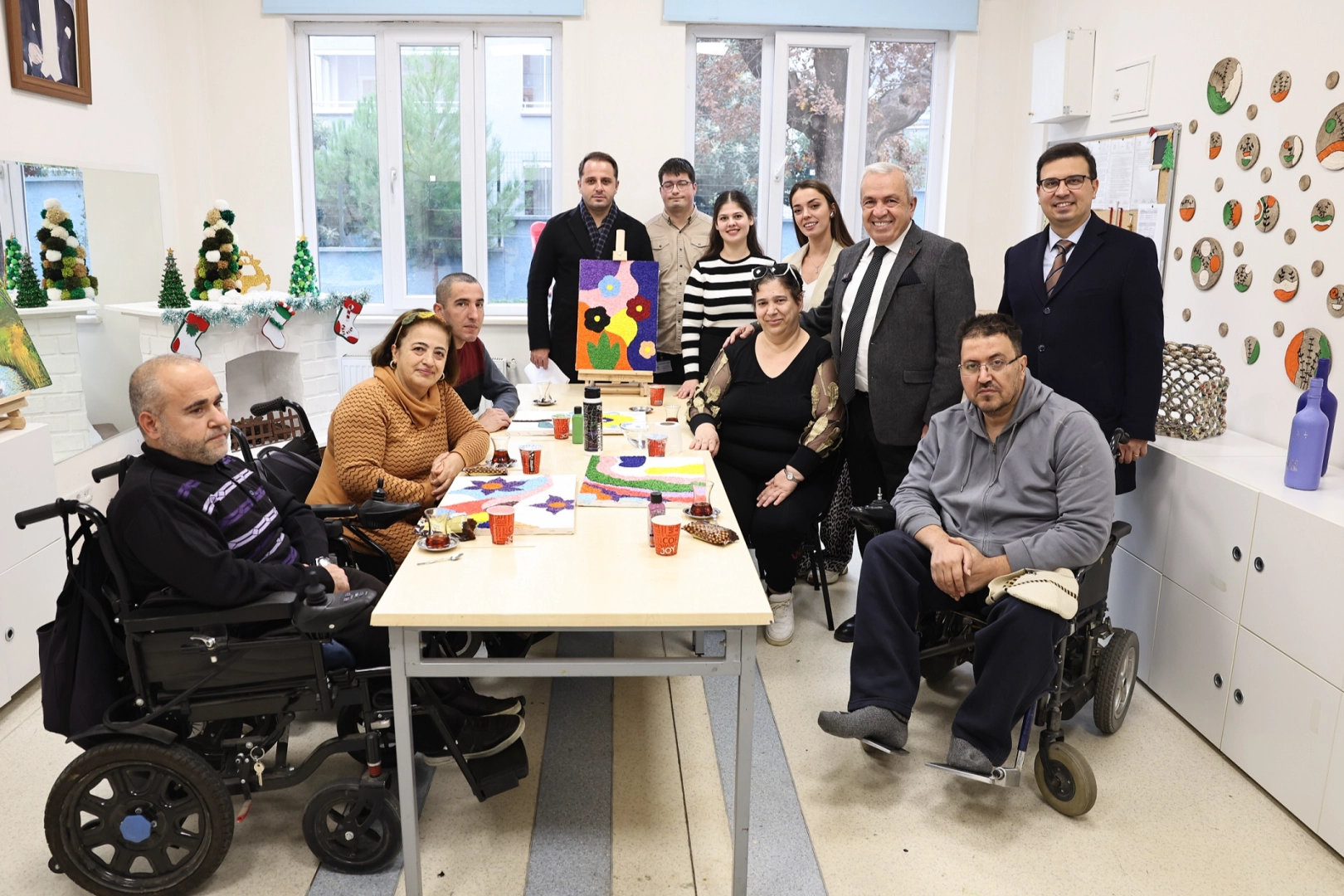 Başkan Şadi Özdemir, Başkan Yardımcısı Okan Şahin ve birim çalışanları ile birlikte Bizim Ev’de devam eden kursları tek tek gezerek el işi, tablo ve resim gibi sanatsal çalışmalar gerçekleştiren engelli bireylerle sohbet etti.