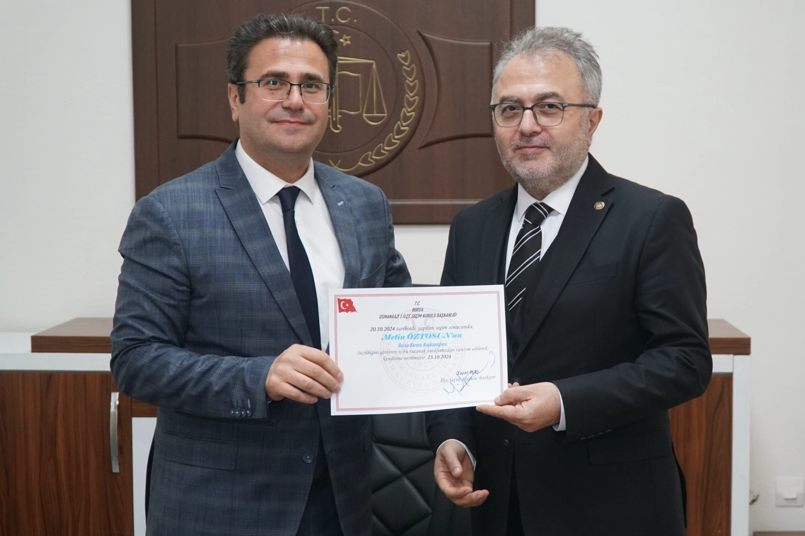 Bursa Barosu’nda yeniden başkanlığa seçilen Av. Metin Öztosun, mazbatasını Bursa İl Seçim Kurulu Başkanı Yaşar Baş’tan aldı.