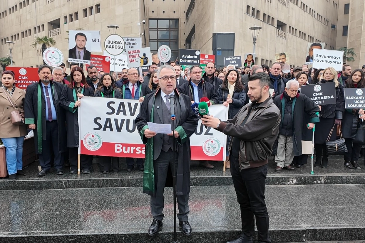 Bursa Barosu, başkan ve kurul üyeleriyle birlikte çok sayıda avukat, Bursa Adalet Sarayı önünde, avukatlara yönelik fiziki saldırılara ve özellikle genç avukatları açlığa mahkum eden düşük CMK ücret tarifesine tepki gösterdi.