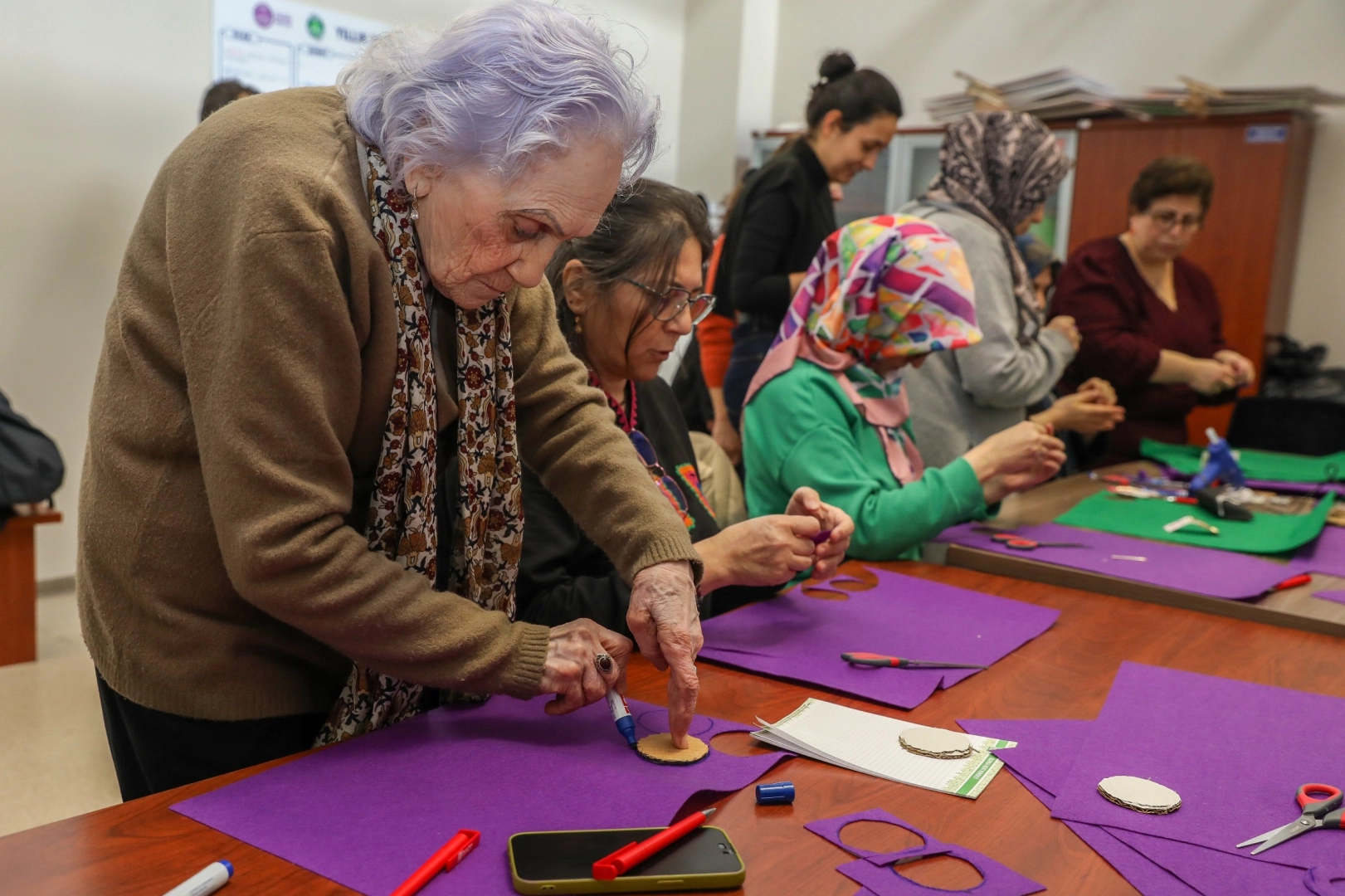 Bursa Kent Konseyi Kadın Meclisi'nde gerçekleştirilen atölye çalışmasında, keçe kumaşlar, renkli iplikler, düğmeler ve süsleme malzemeleri kullanılarak birbirinden renkli ürünler hazırlandı. Kadınların dayanışma ve ortak üretim gücünü bir kez daha ortaya koyan ürünler, 8 Mart Pazar günü yapılacak yürüyüşte kullanılacak. Kadın mücadelesinin simgeleriyle zenginleştirilen çalışmalarda katılımcılar hem kendi tasarımlarını oluşturdu hem de fikir alışverişinde bulunarak kolektif üretim deneyimi yaşadı. Keyifli vakit geçiren ve ortak bir amaç doğrultusunda üretmenin mutluluğunu paylaşan kadınlar, düzenlenen etkinlik dolayısıyla Bursa Büyükşehir Belediyesi'ne ve Bursa Kent Konseyi'ne teşekkür etti.