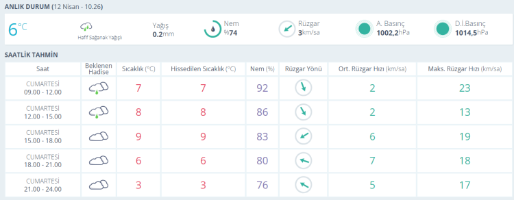Yapılan son değerlendirmelere göre, ülke genelinin parçalı ve çok bulutlu, Marmara, Ege, Batı Akdeniz ve Hatay çevreleri, İç Anadolu, (Giresun ve Gümüşhane hariç) Karadeniz ile Doğu ve Güneydoğu Anadolu'nun doğusunun yağışlı geçeceği tahmin ediliyor. Meteoroloji Genel Müdürlüğünden alınan tahminlere göre; kıyı kesimler ile Güneydoğu Anadolu'da yağmur ve sağanak, iç ve yüksek kesimlerde karla karışık yağmur ve kar şeklinde görülmesi beklenen yağışların, Bolu, Bartın ve Karabük çevreleri ile Kastamonu kıyılarında kuvvetli olacağı tahmin ediliyor. Sabah ve gece saatlerinde iç ve doğu kesimlerde buzlanma ve don olayı bekleniyor. Doğu Karadeniz’in iç kesimlerinin yüksekleri ile Doğu Anadolu’nun yüksek ve eğimli alanlarında çığ tehlikesi bulunuyor. Mevsim normallerinin altında seyreden hava sıcaklıklarının batı bölgelerinden başlamak üzere artması bekleniyor. Rüzgarın ise genellikle kuzeyli, doğu kesimlerde güneyli yönlerden hafif, ara sıra orta kuvvette; Batı Karadeniz kıyıları ile Doğu Anadolu’nun güneydoğusunda kuvvetli (40-60 kilometre/saat) esmesi bekleniyor. Bazı illerde beklenen hava durumuyla günün en yüksek sıcaklıkları ise şöyle: Ankara: Parçalı ve çok bulutlu, öğleden sonra ve akşam saatlerinde hafif karla karışık yağmur ve yüksekleri kar yağışlı 5 İstanbul: Parçalı ve çok bulutlu, akşam saatlerine kadar aralıklı yağmurlu 11 İzmir: Parçalı ve çok bulutlu, öğleden sonra ve akşam saatlerinde yağmur ve sağanak yağışlı 16 Adana: Parçalı ve çok bulutlu, gece saatlerinde kıyıları sağanak yağışlı 18 Antalya: Çok bulutlu ve aralıklı sağanak yağışlı 19 Samsun: Çok bulutlu ve aralıklı yağmurlu, iç ve yüksek kesimleri karla karışık yağmur ve kar yağışlı 11 Trabzon: Çok bulutlu ve aralıklı yağmurlu, iç ve yüksek kesimleri karla karışık yağmur ve kar yağışlı 10 Erzurum: Çok bulutlu ve aralıklı kar yağışlı 1 Diyarbakır: Parçalı ve çok bulutlu, sabah saatlerinde yağmurlu 13