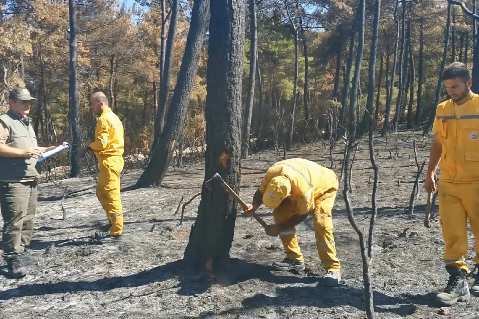 Orman Bölge Müdürlüğü ekipleri, alandaki yanan ağaçların kesilip kesilmeyeceğine ve yerine dikilecek fidanların tespitini aralıksız sürdürüyor.