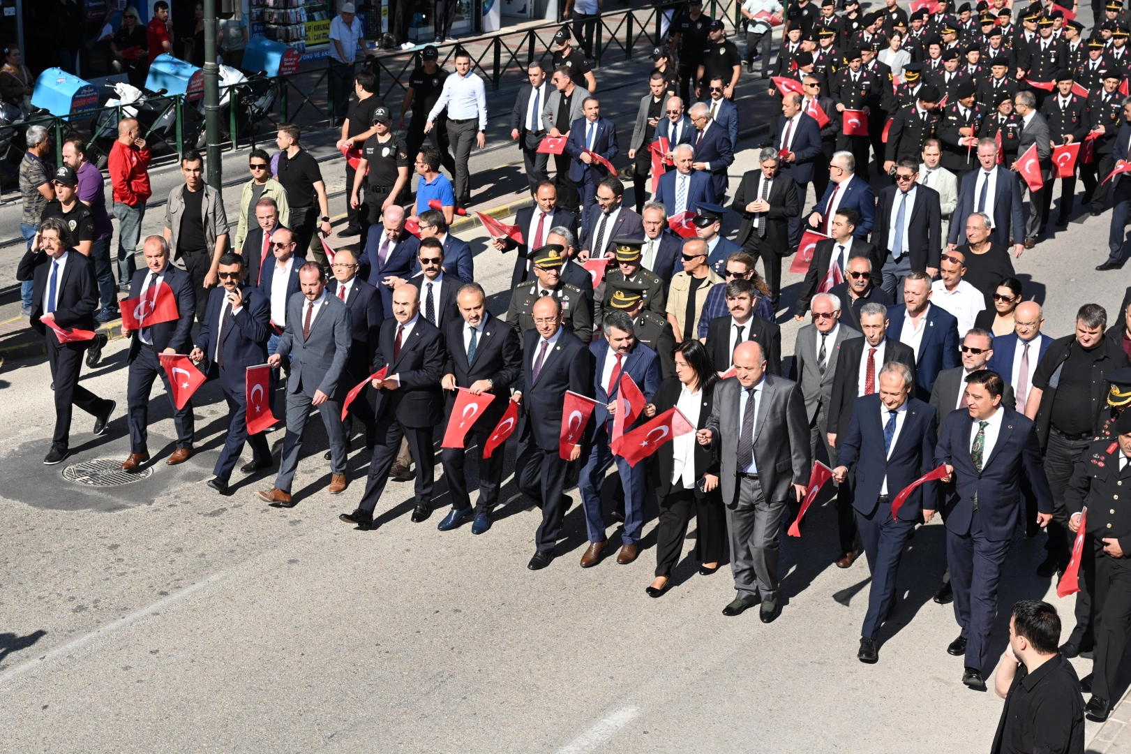 Türk bayrakları ile tarihi belediye binasının önüne gelen milis kuvvetleri, vatandaşlardan alkış aldı. İstiklal Marşı'nın okunması sırasında tarihi belediye binasındaki Türk bayrağı, gaziler tarafından göndere çekildi. Daha sonra Ulu Cami'nden kurtuluş salası okundu. Ardından milis kuvvetleri temsilcileri, Türk bayrağını öperek Büyükşehir Belediyesi Başkanvekili Fethi Yıldız’a teslim etti. Başkanvekili Fethi Yıldız, gazilere çiçek takdim etti.