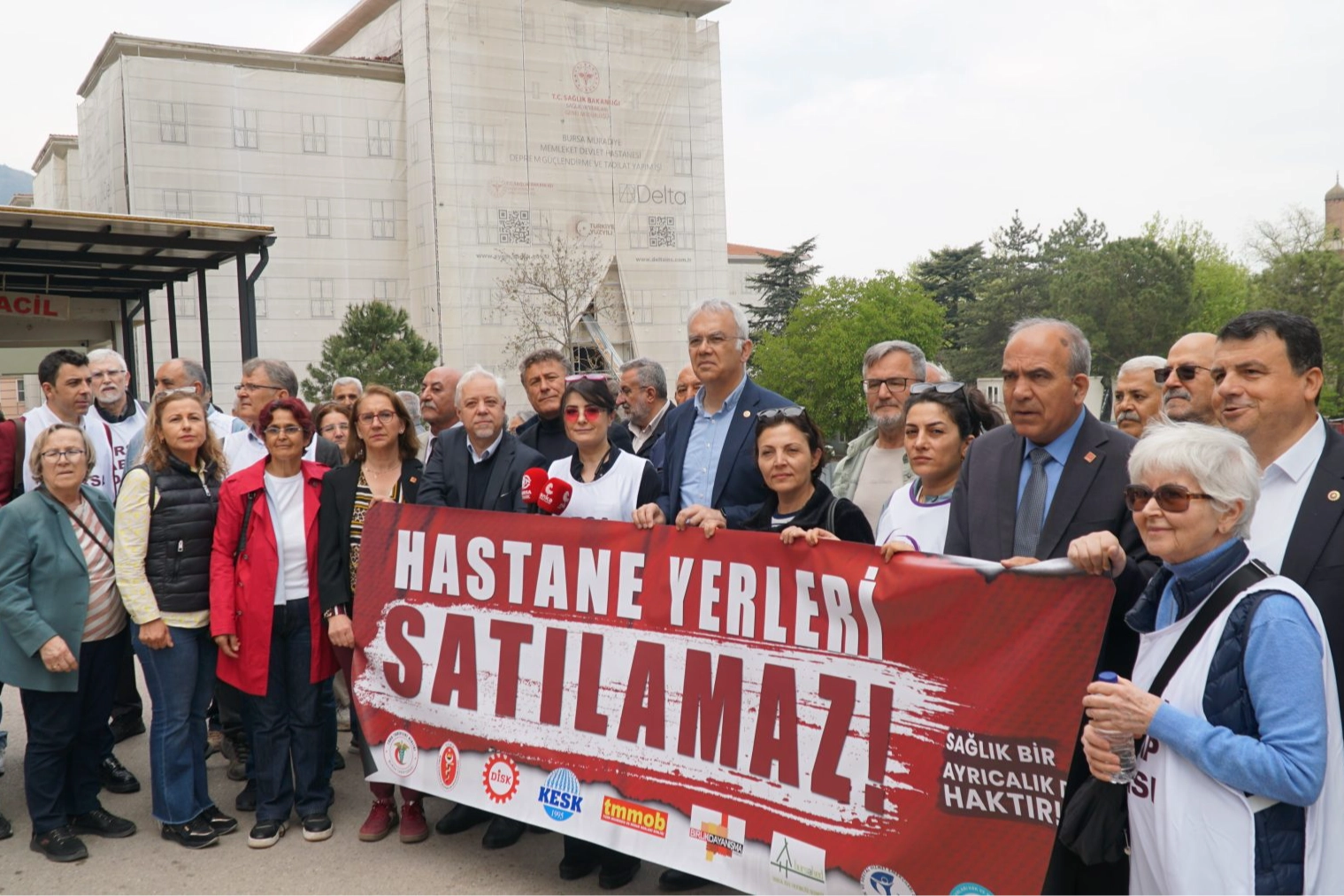 Resmi Gazete’de yayımlanan kararlarla Bursa’nın en köklü sağlık tesislerinin özelleştirme kapsamına alınması, kentin tüm dinamiklerini harekete geçirdi. Bursa Tabip Odası, akademik odalar, DİSK, KESK ve çok sayıda sağlık sendikasıyla birlikte Ali Osman Sönmez Onkoloji Hastanesi önünde tarihi bir basın açıklaması gerçekleştirdi. "Hastane Yerleri Satılamaz!" pankartı açan bileşenler, sağlık hakkının ticari bir meta haline getirilmesine izin vermeyeceklerini haykırdı.