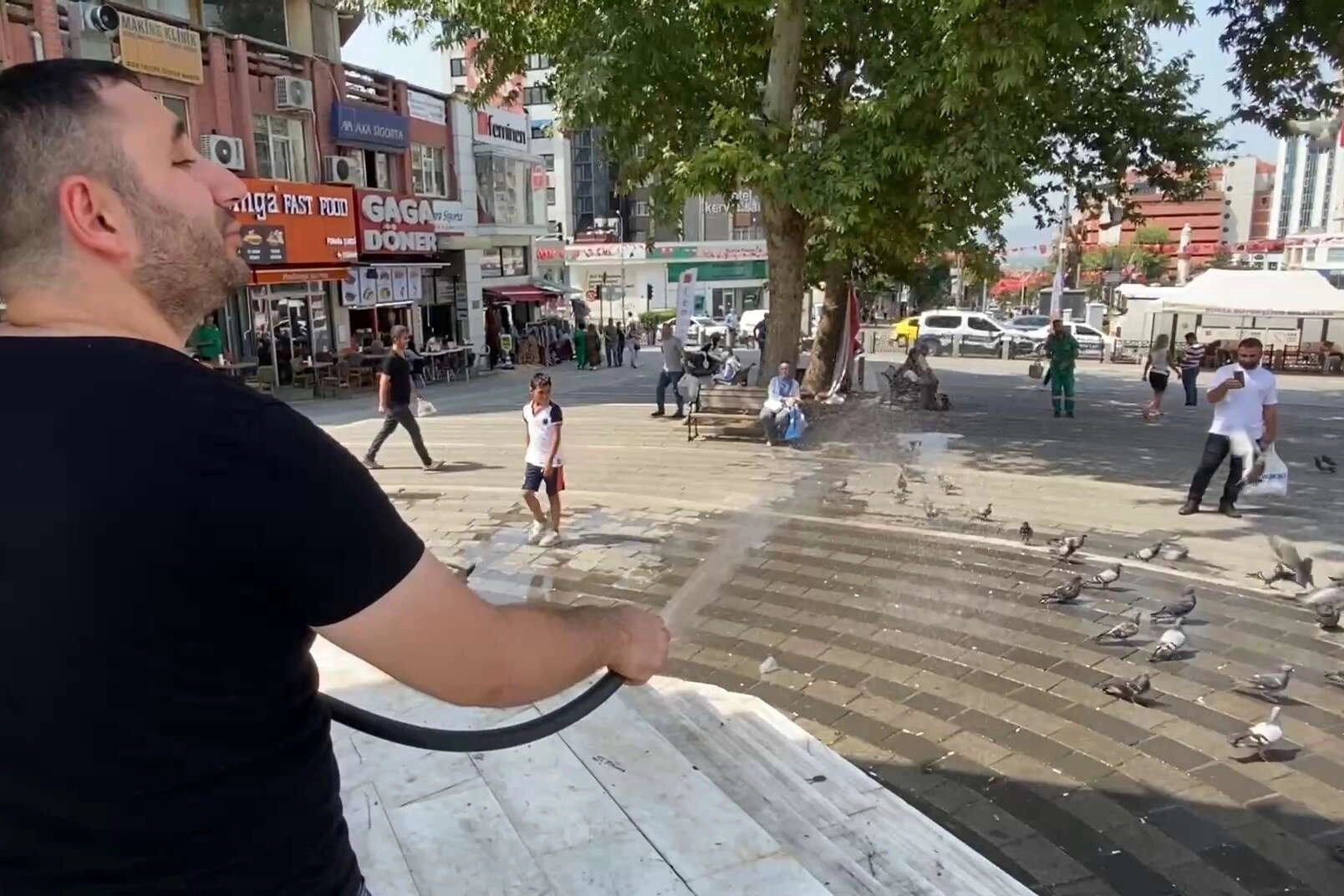 15 Temmuz Demokrasi Meydanı’nda bir esnaf, sıcaktan bunalan güvercinlerin imdadına yetişti.