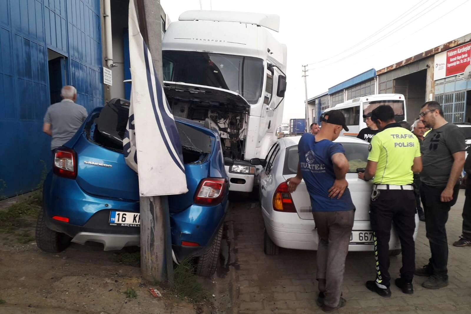 Hızlanan TIR park halindeki 16 FJ 667 ve 16 KFG 12 plakalı otomobillere çarparak durabildi.