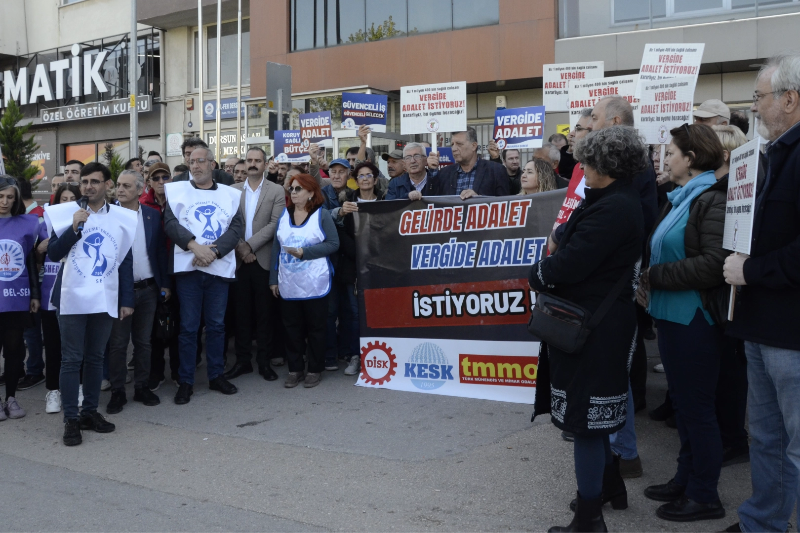 Bursa Vergi Dairesi önünde yapılan açıklamada, ‘Artık yeter, geçinemiyoruz. Kararlıyız bu oyunu bozacağız’ denildi. Yapılan ortak açıklamayı DİSK Güney Marmara Bölge Temsilcisi, Birleşik Metal-İş Bursa Şube Başkanı Gökhan Aydın okudu. Aydın tarafından okunan açıklama şöyle: