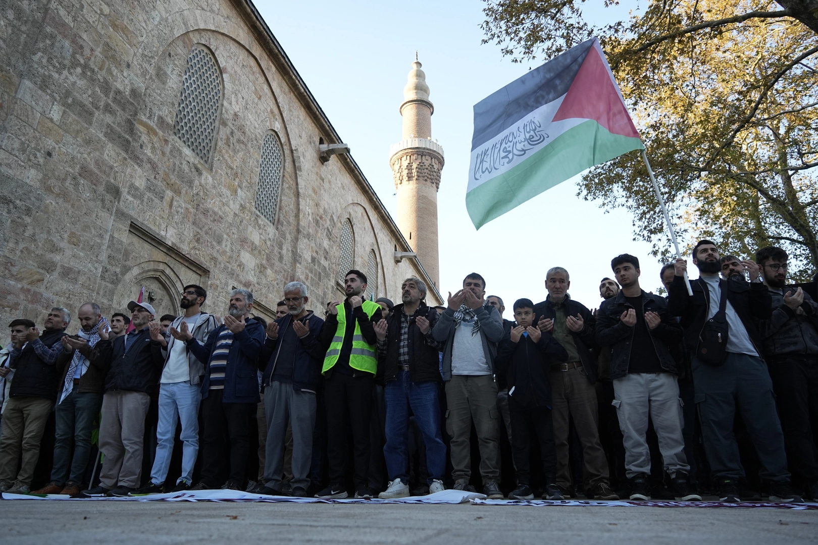 Bursa'da Gazze Dayanışma Platformu üyeleri, İsrail'in Gazze Şeridi'ne düzenlediği saldırıda hayatını kaybeden Hamas Siyasi Büro Başkanı Yahya Sinvar ve Filistin'de hayatını kaybedenler için önce yürüdü ardından gıyabi cenaze namazı kıldı.