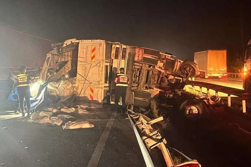 Hüseyin A.’nın kullandığı 03 L 23034 plakalı TIR, İzmir yolunda ilerlerken direksiyon hakimiyeti kaybedilince orta refüjde yan yattı. TIR yan yatmasının ardından sürüklenerek karşı şeridi kapatırken, Bursa istikametine seyir halinde olan Beyhan G.’nin kullandığı 16 T 6024 plakalı taksi TIR'dan yola saçılan yüke çarptı.