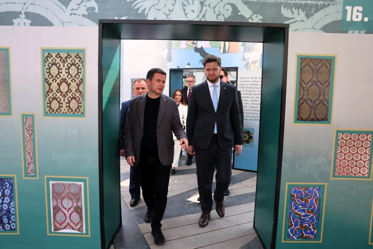Osmangazi Belediye Başkanı Erkan Aydın, Bursa’nın fethinin 700. yılı kutlamaları için gelen kardeş şehir heyetlerini ağırladı ve Osmangazi Meydanı'ndaki sergiyi gezdi.