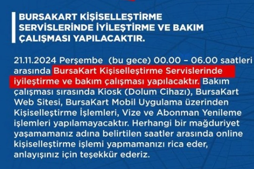 BursaKart kişiselleştirme servislerinde 21.11.2024 tarihinde iyileştirme ve bakım çalışması yapılacak. BURULAŞ çalışma ile ilgili duyuruda bulundu.