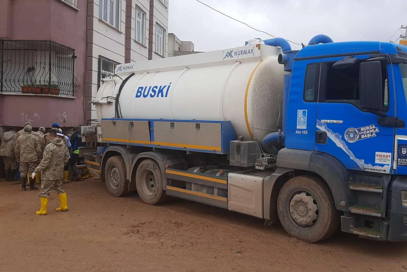 Deprem bölgesinden sevk edilen 2, Bursa’dan da yola çıkarılan 1 olmak üzere toplam 3 vidanjörle tahliye çalışmaları devam ederken, BUSKİ ekipleri, sel felaketinin izleri silinene kadar bölgedeki çalışmalarını sürdürecek.