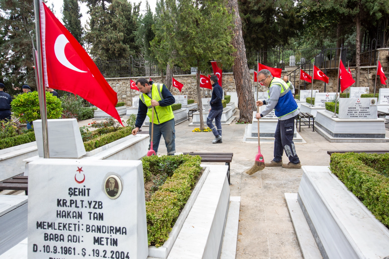 Pınarbaşı Şehitliği başta olmak üzere 17 ilçedeki şehitlikleri titizlikle temizleyen ekipler, 18 Mart Çanakkale Zaferi’nde aziz şehitlerin hatıralarına yakışır şekilde, şehitlikleri ziyarete hazır hale getirdi.
