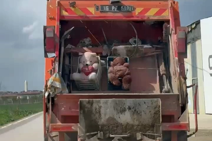 Bursa'nın İnegöl ilçesinde çöp kamyonunun arkasındaki oyuncak ayılar görenlerin dikkatini çekti. Temizlik görevlerinin ayıları aracın arkasına asması görenleri hayrete düşürdü. Bayramda da İnegöl ilçesinin temizliğine önem veren temizlik görevlileri, çöp toplamaya devam ediyorlar. Çöp kovalarındaki çöpleri kamyonun arkasına atan görevliler, çöpe atılan iki oyuncak ayıyı kamyonun içine atmaya kıyamayınca ortaya güzel görüntüler çıktı. Görevliler ayıları kamyonun arkasına astılar. O anlar, Ortaköy Mahallesi'nde bir sürücünün amatör kamerasına yansıdı.