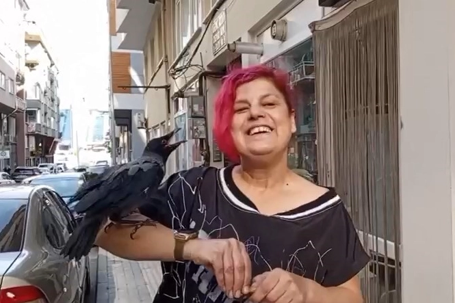 Omzunda karga ile sokak sokak gezen Filiz Kaya, çocukların çok sevdiği 'Ege ile Gaga'yı akıllara getirdi.