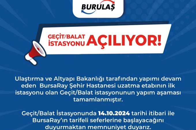 ???? Geçit/Balat İstasyonu Açılıyor! ????Ulaştırma ve Altyapı Bakanlığı tarafından yapımı devam eden BursaRay Şehir Hastanesi uzatma etabının ilk istasyonu olan Geçit/Balat istasyonunun yapım aşaması tamamlanmıştır. Geçit/Balat İstasyonunda 14.10.2024 tarihi itibari ile… pic.twitter.com/xMW8TcLNox